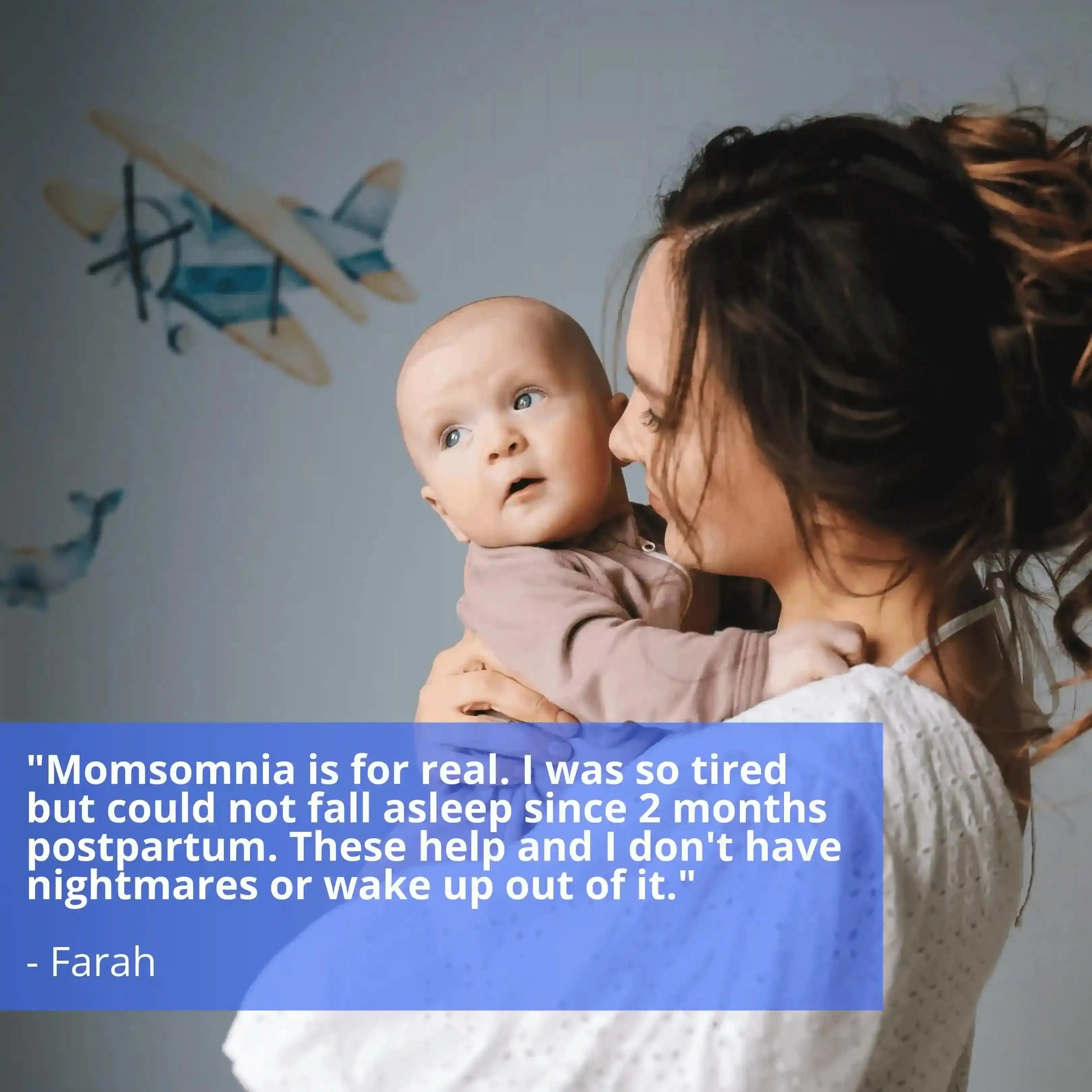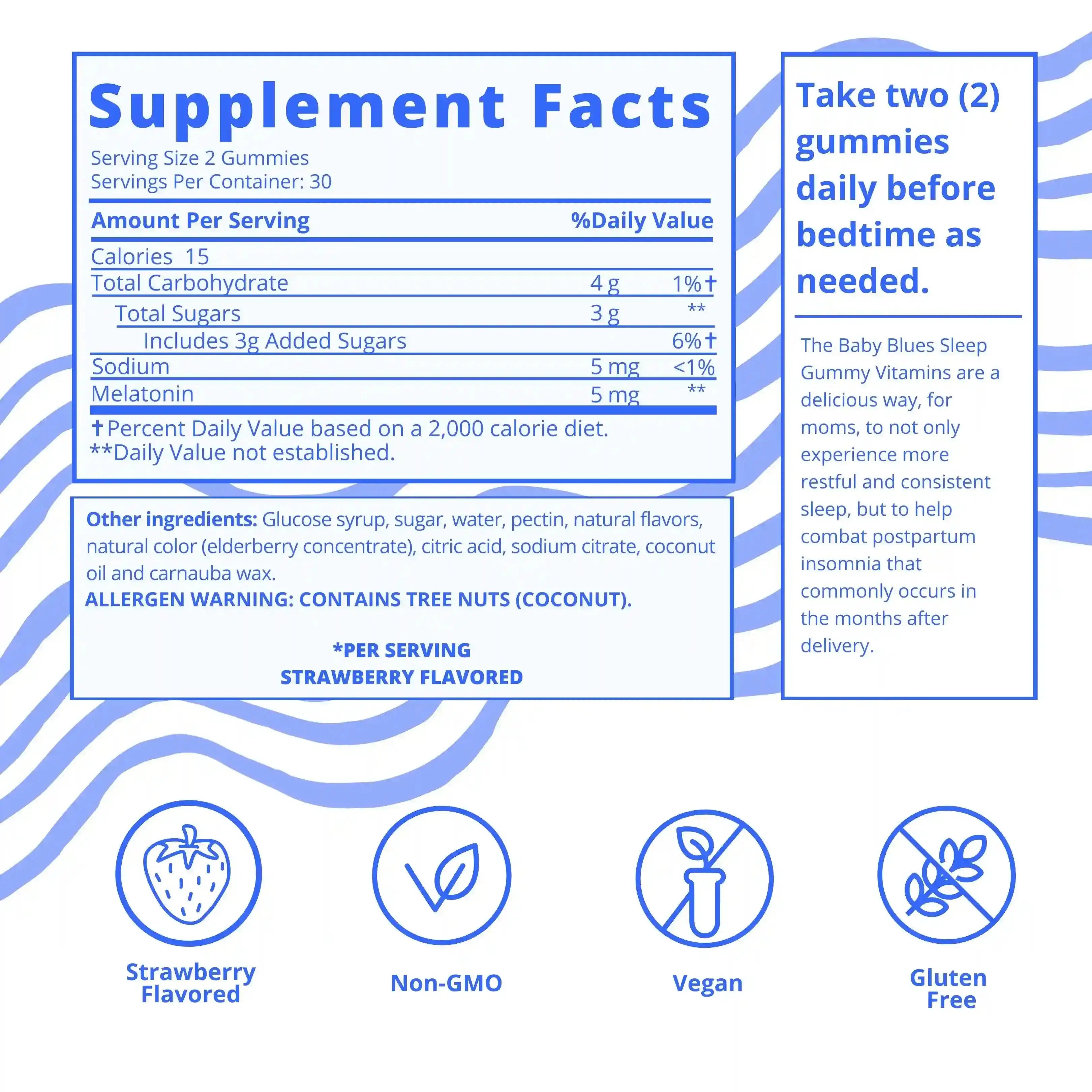Postpartum insomnia is real and it doesn’t always go away once the baby starts sleeping through the night. That’s why we created Baby Blues Sleep Gummies: a gentle, non-habit-forming sleep aid made just for moms.