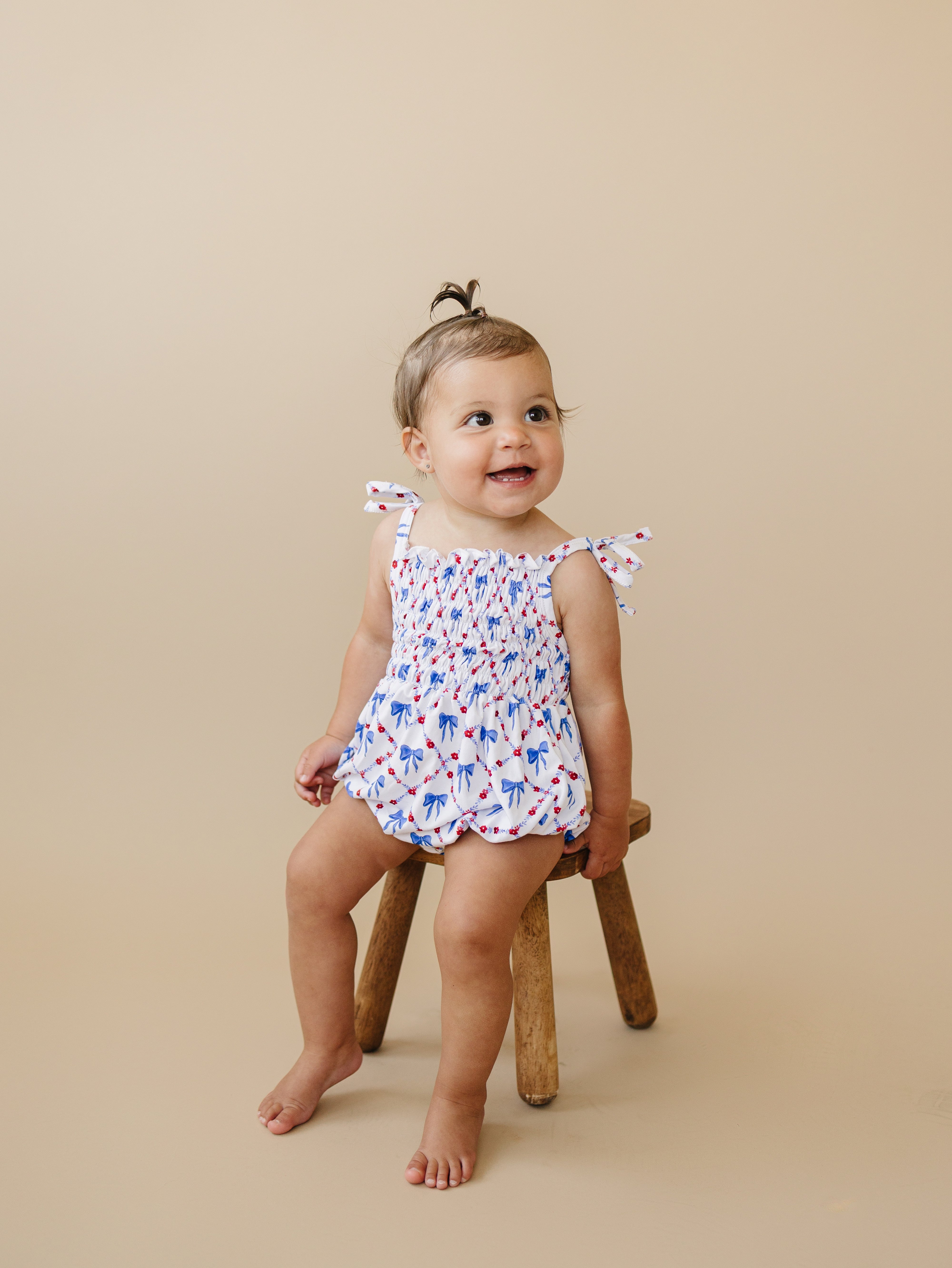 Introducing our Smocked Red, White and Bows Bamboo Bubble, where comfort meets style. 240 gsm fabric crafted from 94% bamboo viscose and 6% spandex. It runs true to size, featuring an oversized fit for endless styling options. Shoulder ties are stitched. Order now for a stylish and comfy addition to your little's wardrobe!
