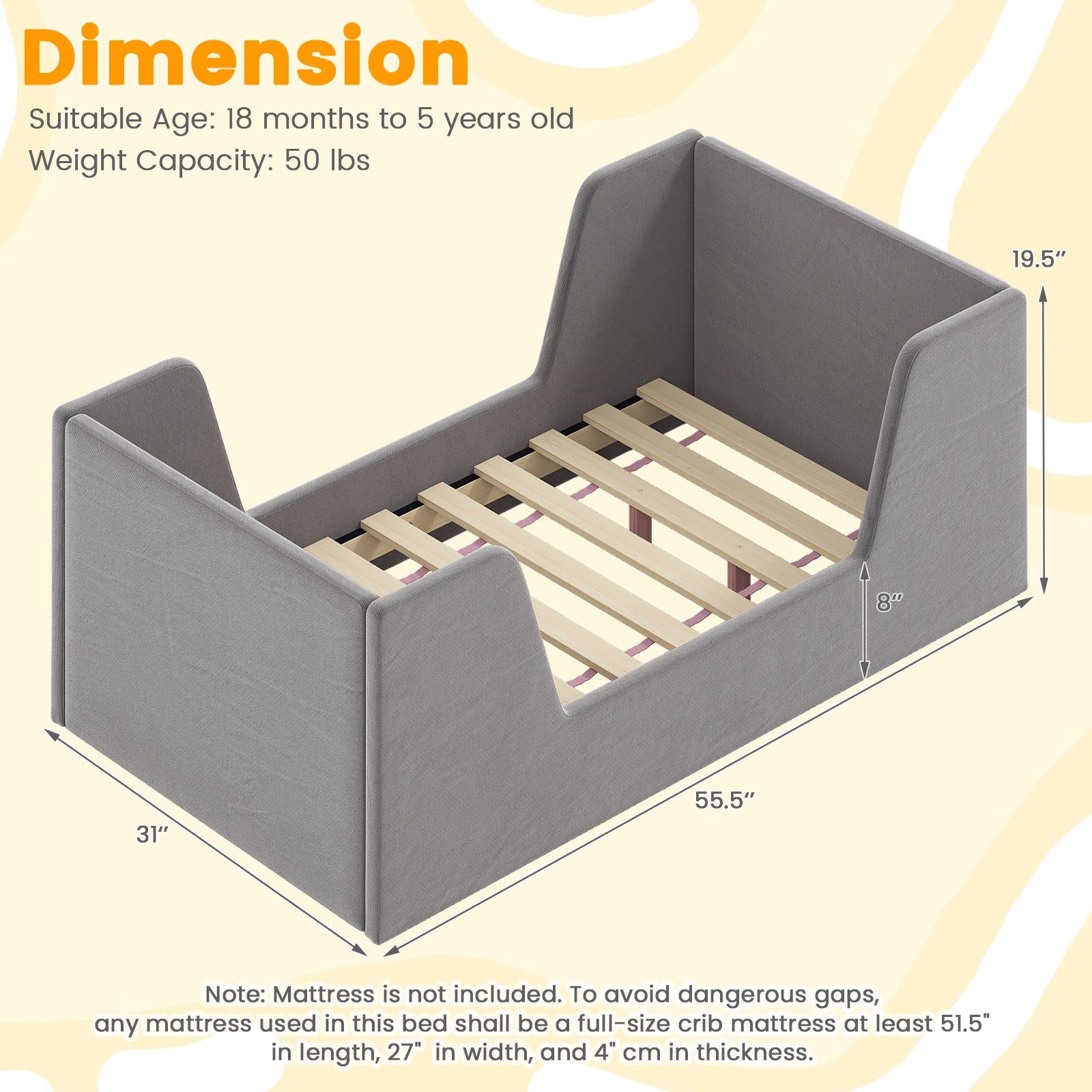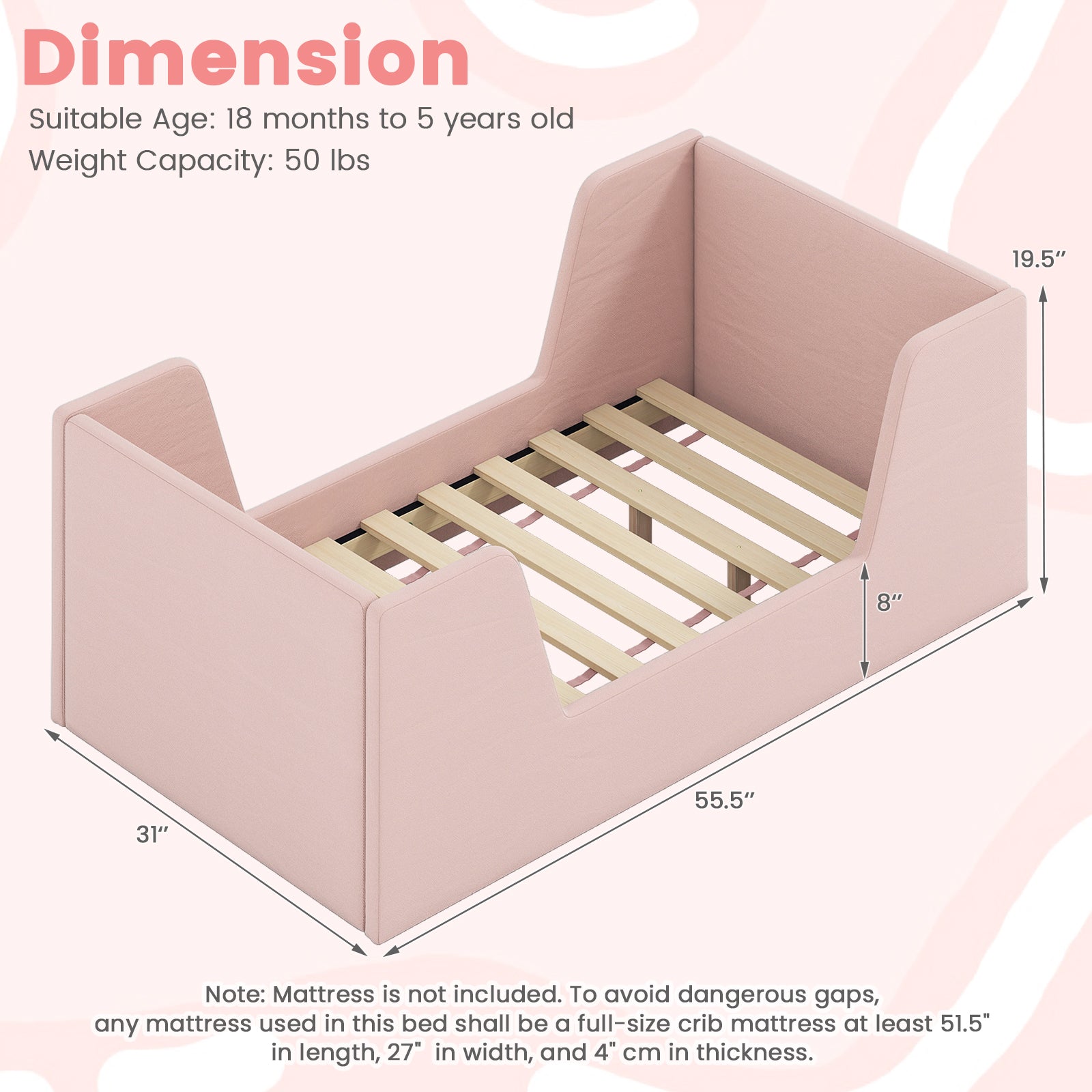 Color Gray/Pink Material Wood + Engineered Wood + Velvet + Foam Overall Dimension  55.5" x 31" x 19.5"(L x W x H) Suitable Age 18 months to 5 years old Weight Capacity 50 lbs Net Weight 58 lbs Is Assembly Required Yes Box Qty 1(May vary by batch) Package Includes 1 x Toddler Bed Frame  1 x User Guide