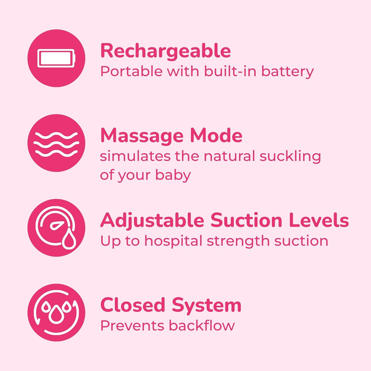 The built-in rechargeable battery provides approximately 1.5 hours of pumping time.