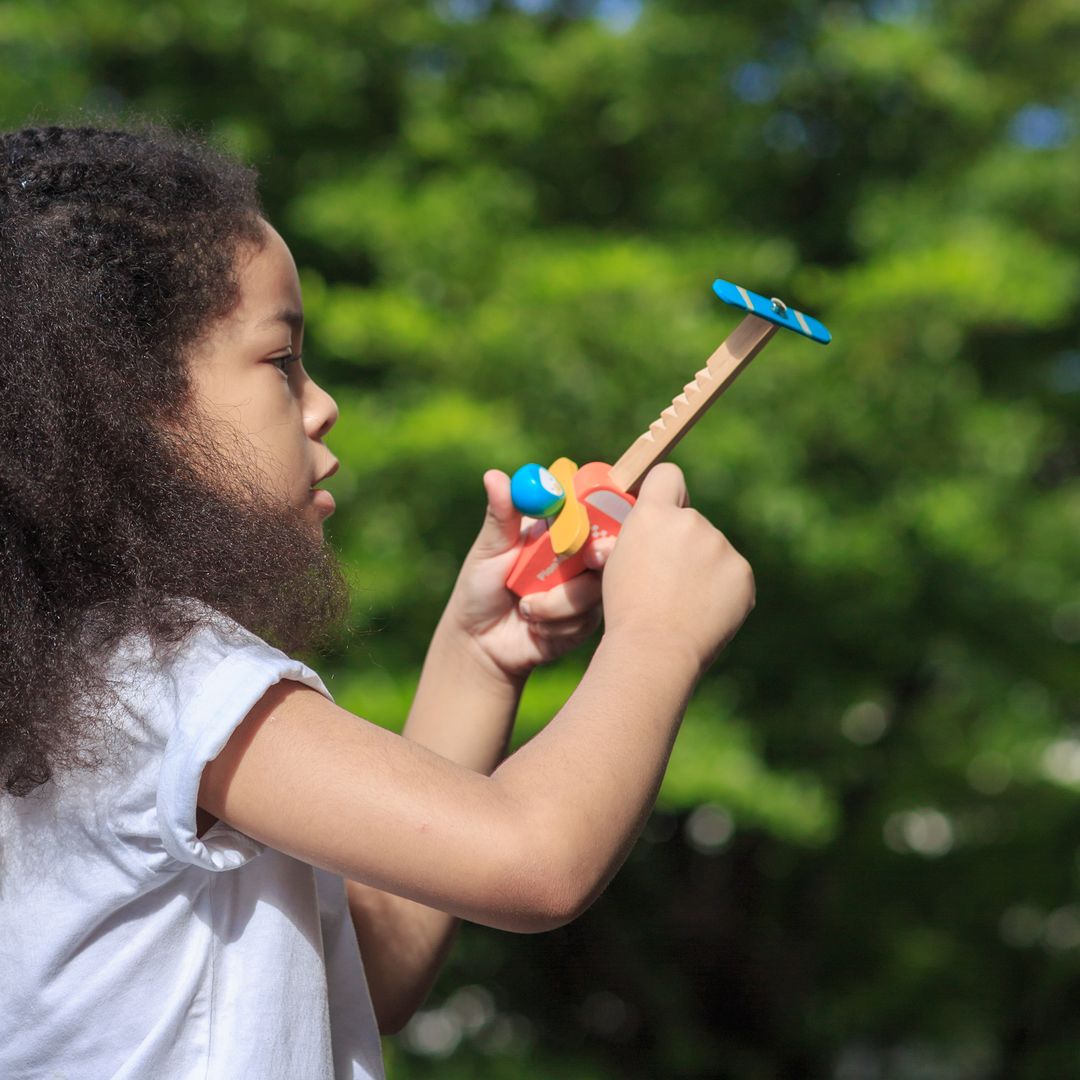 Imagine controlling the airplane as an aviator! This classic toy, also known as “Hui Machine” or “Hooey Stick”, can be played by rubbing the stick over the notches to see the propeller spins. Children can learn about cause and effect of vibration force turning the propeller. It is good for the basic learning of science.