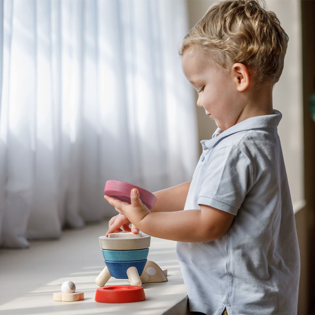 Build the rocket by stacking and matching the pieces, set the astronaut on the seat and start the countdown 3..2..1, lift off!
