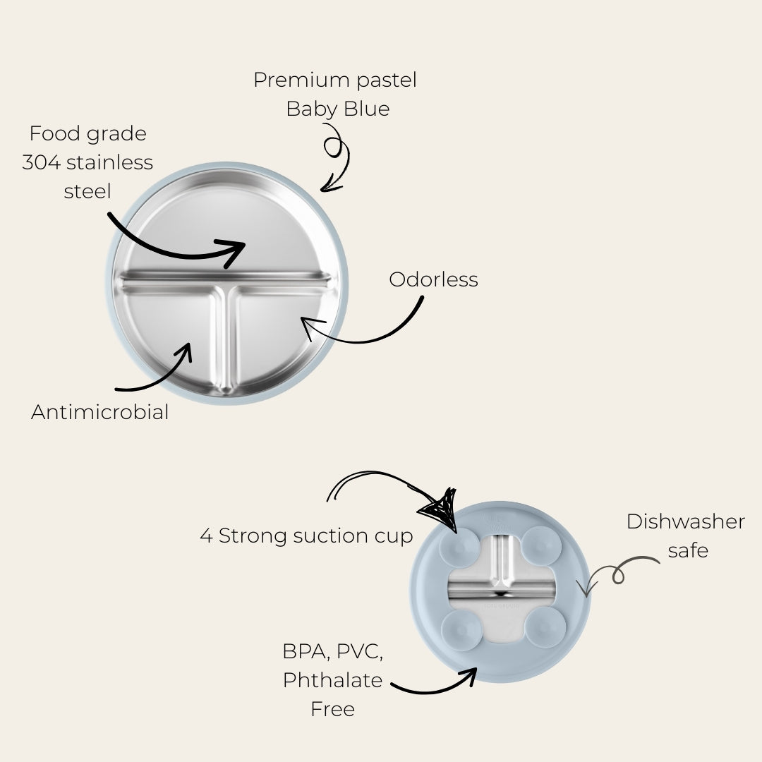 -COMPLETE TODDLER FEEDING SET – Includes 1 stainless steel suction plate, 1 stainless steel spoon and fork set, and 1 adjustable silicone bib—everything older babies need for confident, independent mealtimes.