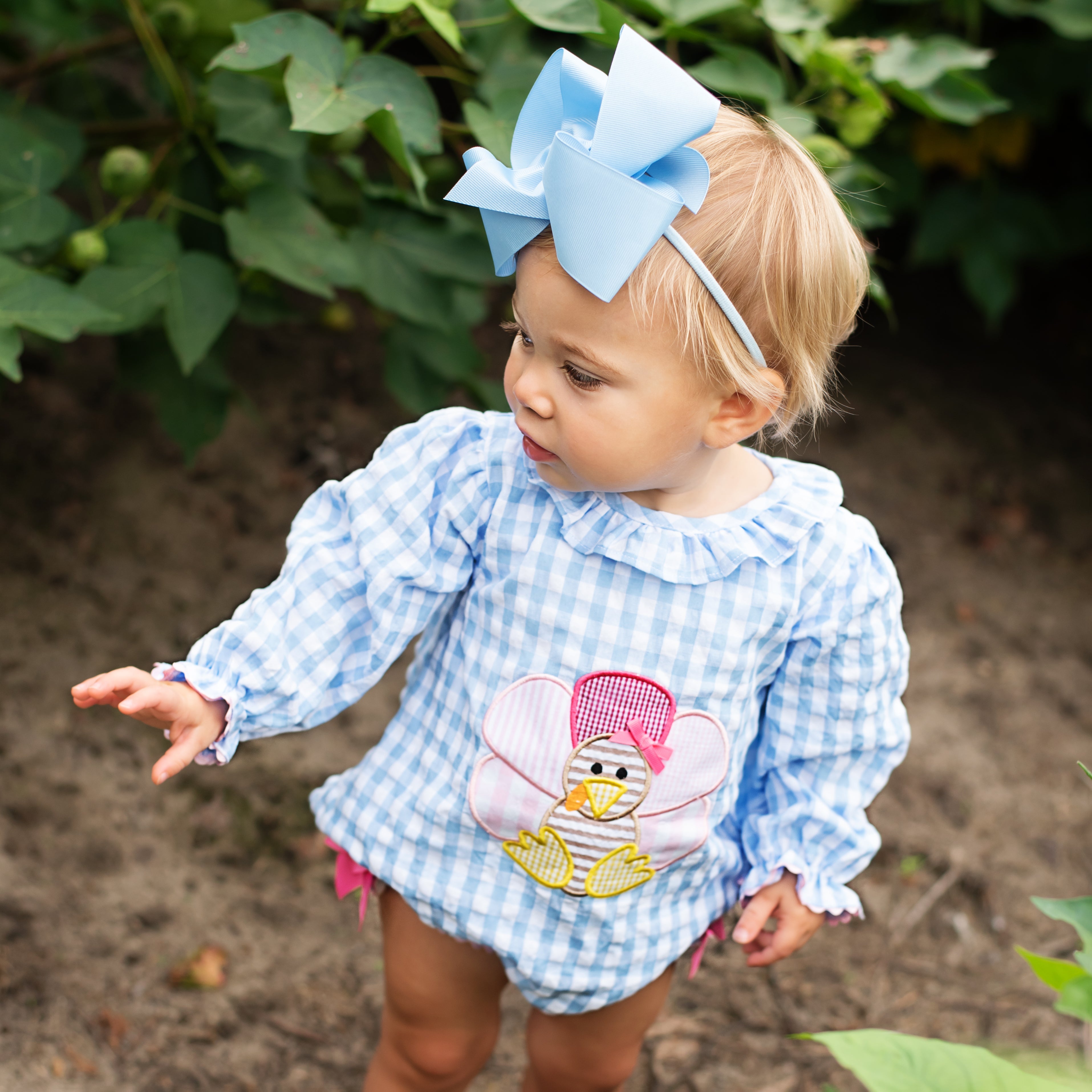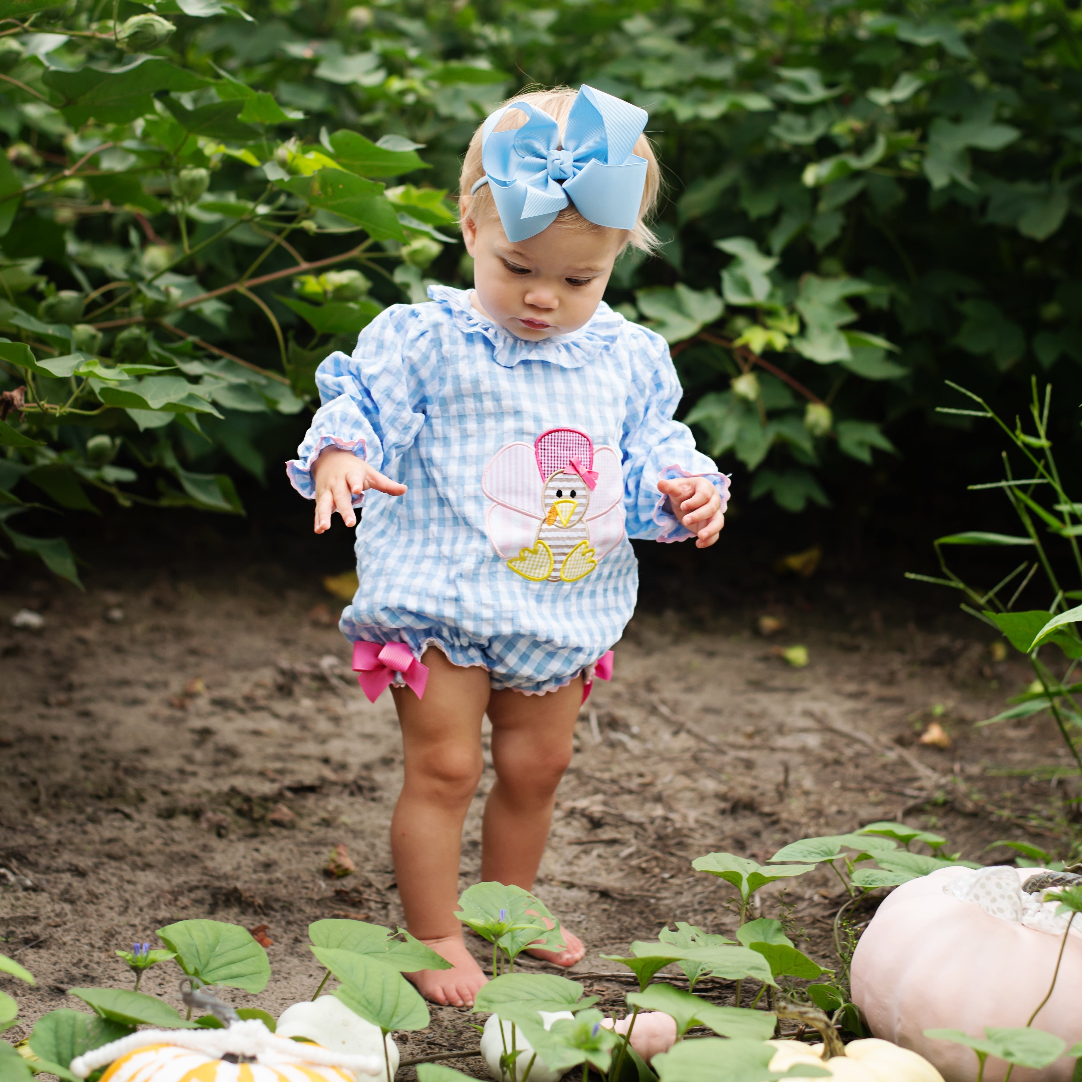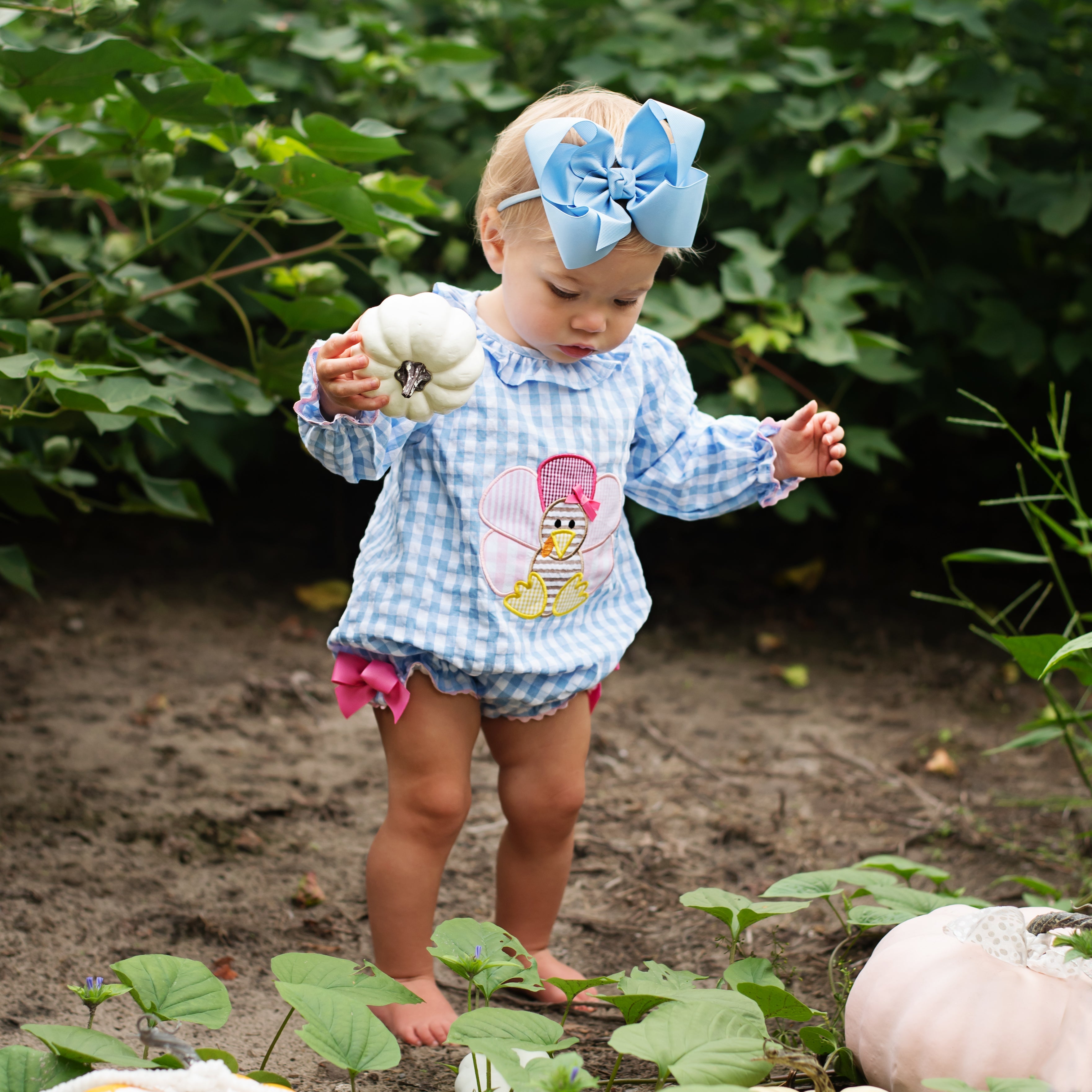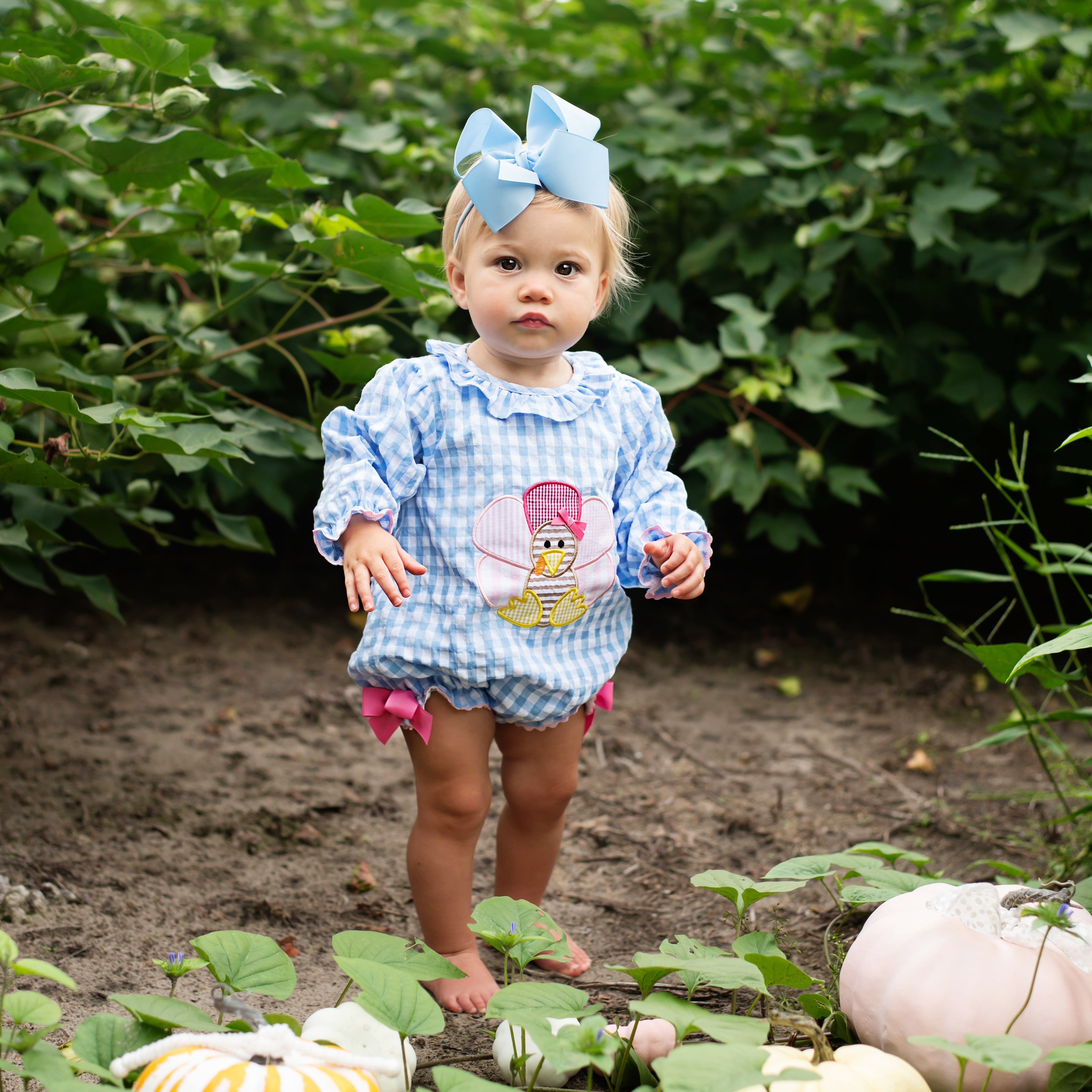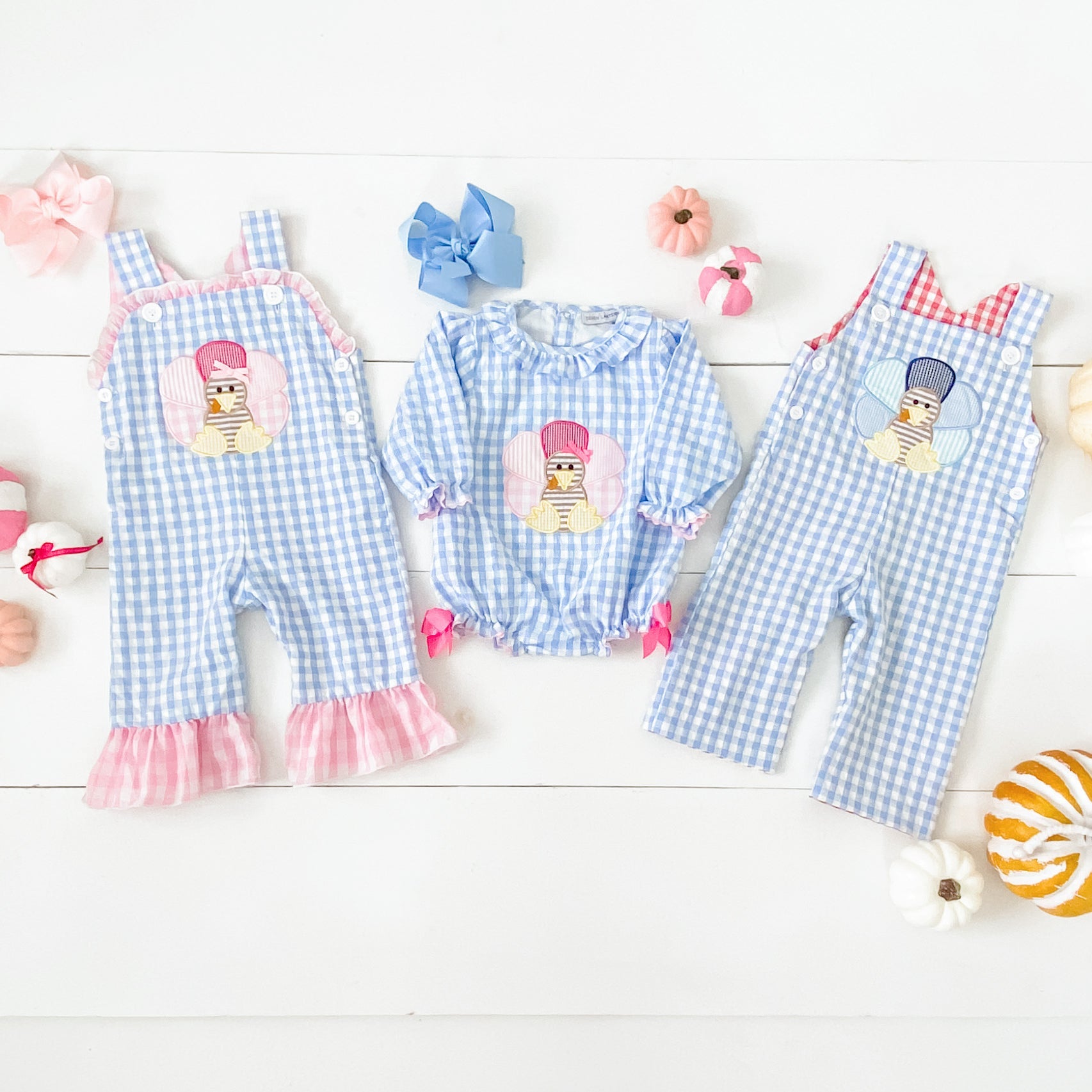 The cutest Thanksgiving Bubble features a Thanksgiving turkey applique on the front with applique turkey tail feathers on bum. Accents of ric rac, ruffles, and bows make this bubble over the top cute!