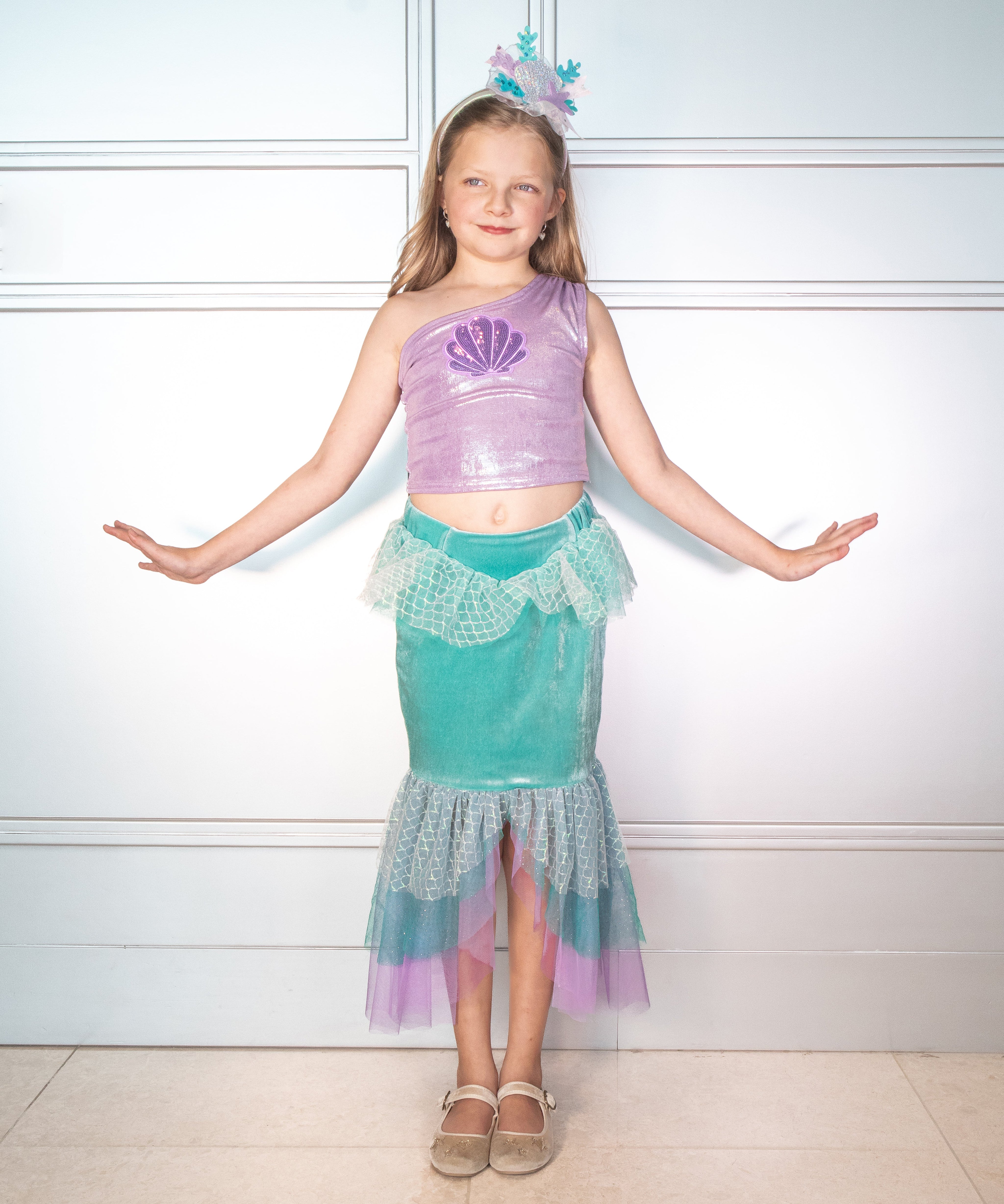 Transform your little one into a magical undersea princess with our Ariel-inspired two-piece costume! The shimmering purple, one-shoulder cropped top is soft and lined for comfort, featuring a sparkling sequin seashell at the center. The turquoise skirt simulates a mermaid tail and it's made from our signature soft, stretchy velvet. This bottom offers an elastic waistband and is lined for easy wear, while the tulle fins shimmer with white and silver scales layered with purple and green tulle, creating a mesmerizing, aquatic effect. Perfect for parties or dress-up, this costume ensures your mermaid shines above and below the sea!