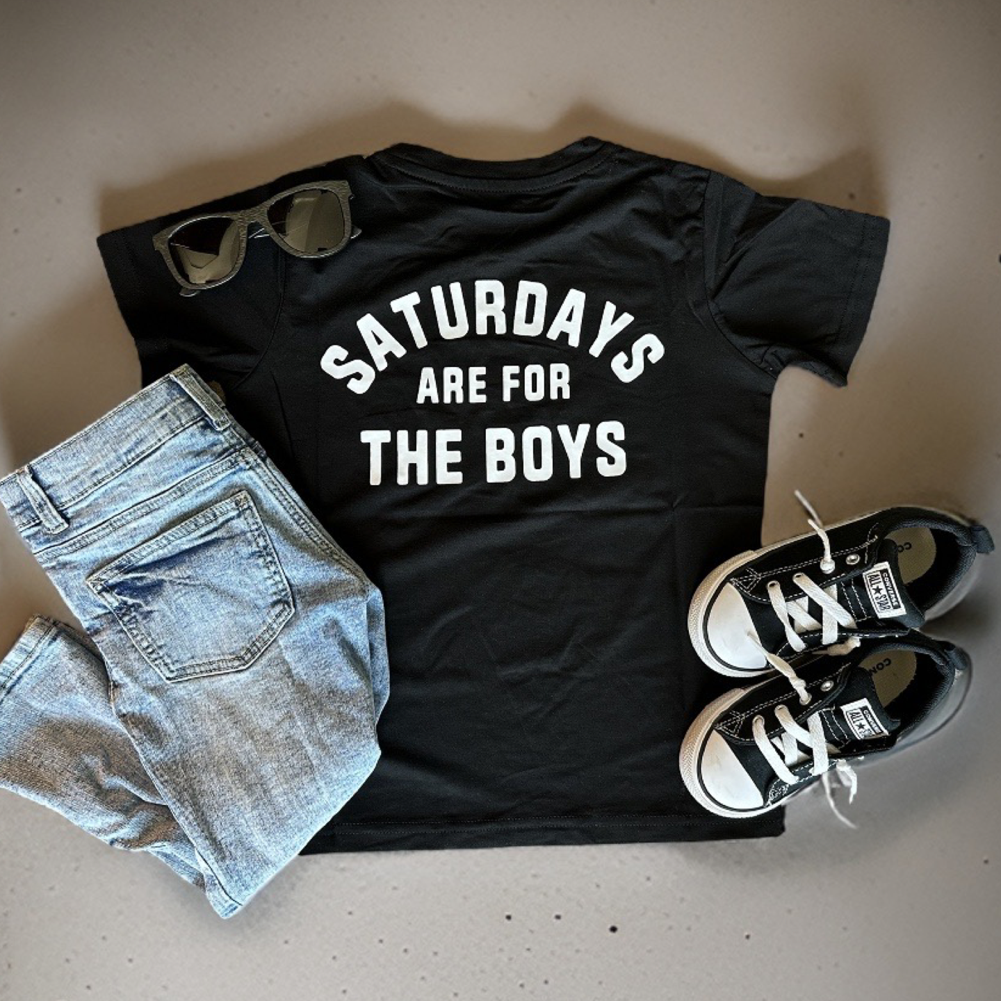 Introducing the perfect addition to your little one's weekend wardrobe: the "Saturdays are for the Boys" Classic Black Tee for kids! The tee features a bold, eye-catching design that perfectly captures the essence of those carefree weekend vibes. With its crisp, white lettering against a sleek black background, this shirt stands out in a crowd while remaining versatile enough to pair with any bottoms, from casual jeans to comfy shorts. The durable fabric holds up to all the running, playing, and exploring that Saturdays are known for, making it a reliable choice for every weekend outing.