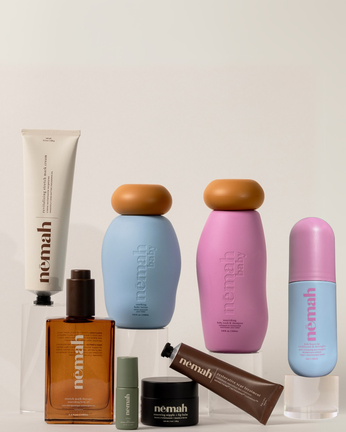 The ultimate gift set: Belly Oil, Stretch Mark Cream, Scar Treatment, Nipple Balm, Aromatherapy Roll On, plus our gentle Wash & Shampoo, Soothing Lotion, and Kids Leave-In Conditioner & Detangler for your littles. Ethically crafted for moms and babies, these nurturing essentials blend science with nature, offering comfort and care for both you and your baby in eco-conscious packaging. The perfect, thoughtful gift for every phase of motherhood and beyond.