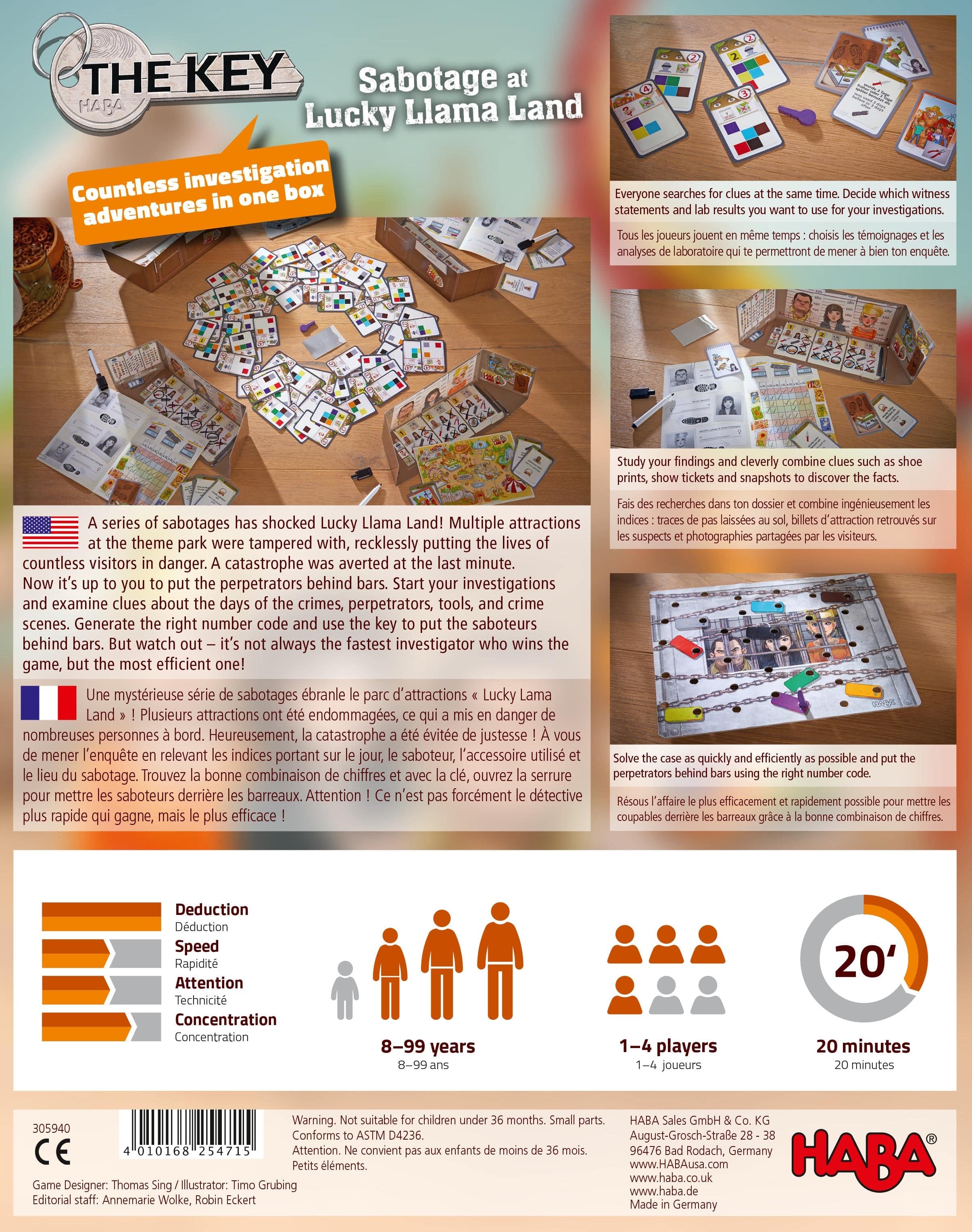 A series of sabotages has shocked Lucky Llama Land! Multiple attractions at the theme park were tampered with. Players start their investigations and combine clues about the days of the crimes, perpetrators, tools, and crime scenes. They need to generate the right number code and use the key to put the saboteurs behind bars. In the end, it’s not necessarily the fastest investigator who wins the game, but the most efficient one.