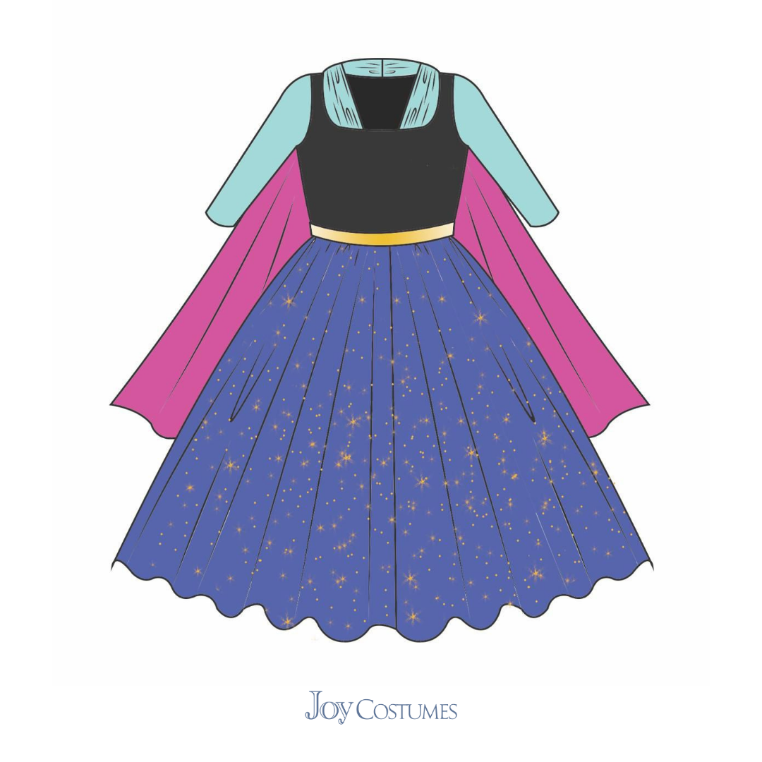 Inspired by the adventurous spirit of Anna’s mountain journey, the Nordic Princess dress brings wintry charm to every little explorer. Its plush black velvet bodice pairs beautifully with soft turquoise mesh sleeves, while a delicate golden trim adorned with tiny flowers adds a touch of royal elegance around the neckline. The full tulle skirt shimmers with glitter at every twirl, and the look is completed with a pink tulle removable cape — perfect for brave hearts, cozy moments, and holiday magic.