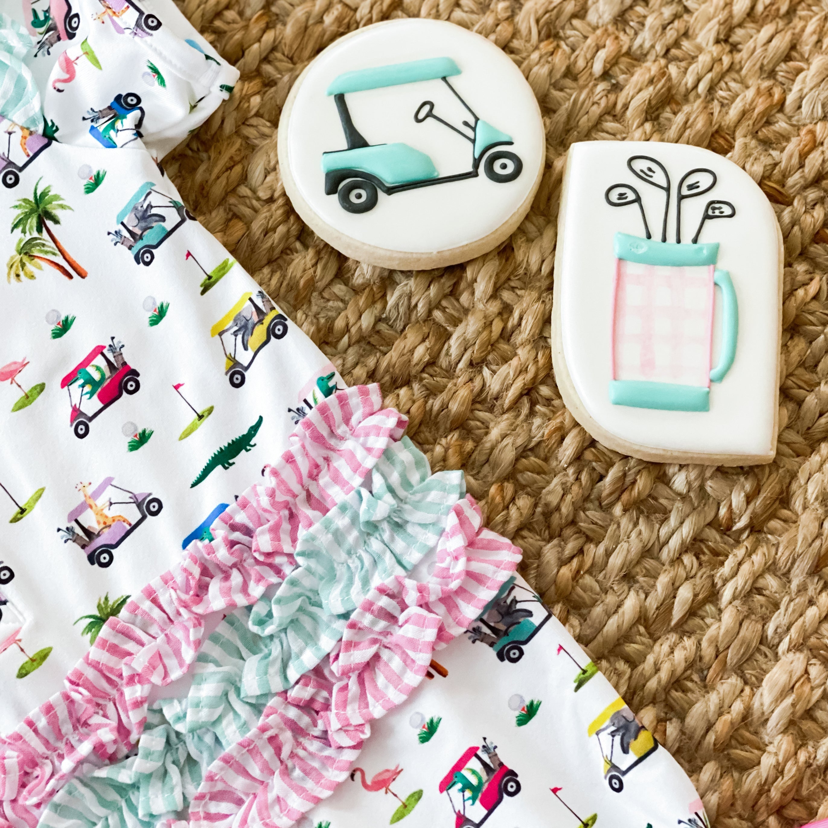 The Palms Girls Golf Romper was designed in collaboration with the talented Katherine Herrell Studio. Super soft and comfy knit with oodles of seersucker ruffles and grosgrain bows. The Palms Golf Romper is the perfect piece for visiting the country club or watching The Masters.