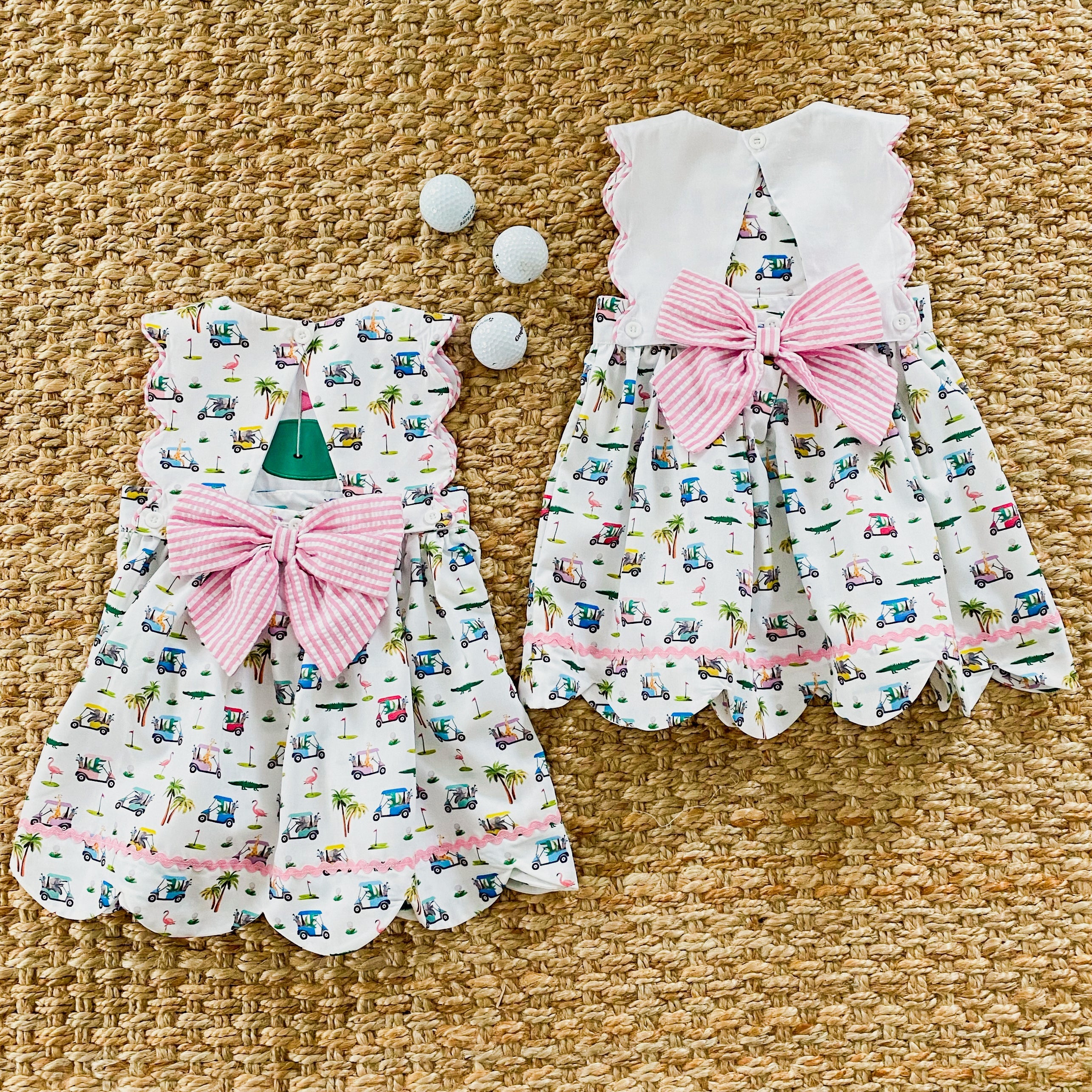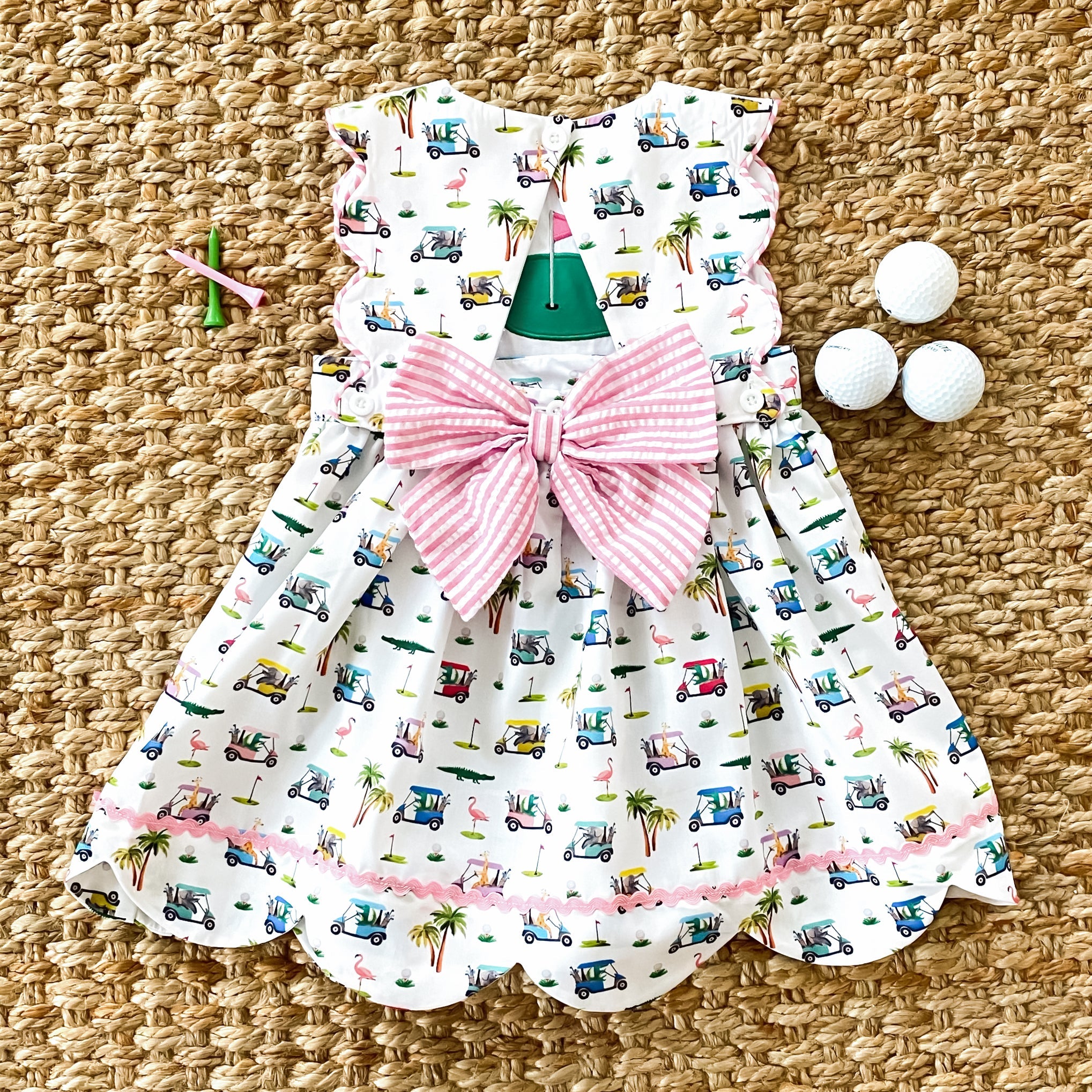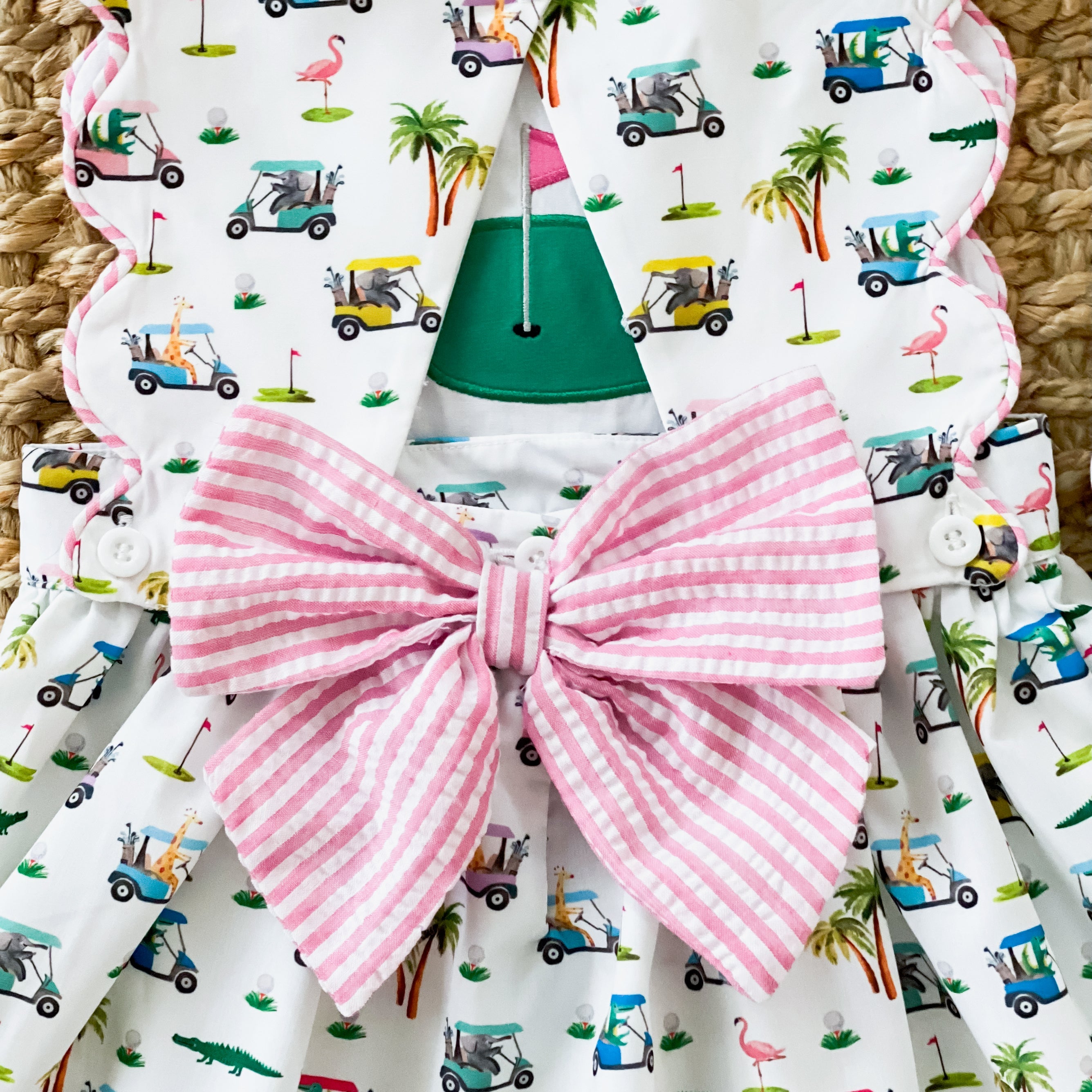Two dresses in one! The Palms Golf Dress features a reversible button on bib. The bib features our beautiful custom designed The Palms golf print on one side and reverses to a golf green applique on the other side. The Palms Golf Dress has a scallop hem, trimmed in ric rac and an oversized seersucker bow on the back.