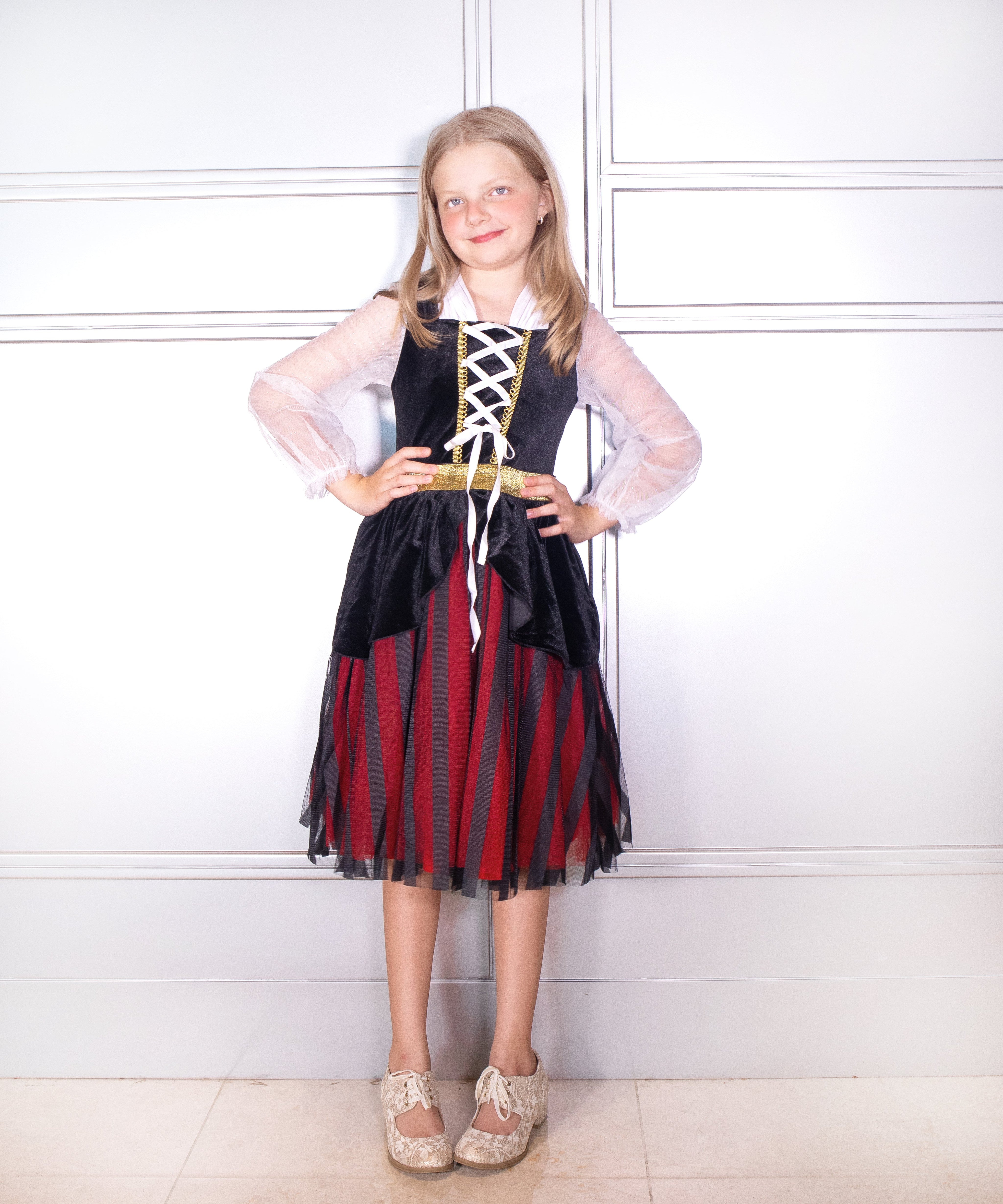 Set sail for adventure in our Pirate Princess dress, the ultimate blend of elegance and daring! This regal yet rebellious look features a striped black and red tulle skirt for a bold, pirate-worthy statement. The black velvet bodice is both luxurious and fierce, complete with a gold belt and a dramatic peplum overlay that adds a touch of royal flair. The lace-up front detail captures the essence of a true swashbuckler, while the Juliette sleeves in airy white tulle bring a soft, whimsical touch. Available in all four sizes, including size L (9-10 years), this dress is perfect for little adventurers ready to command the high seas in style!