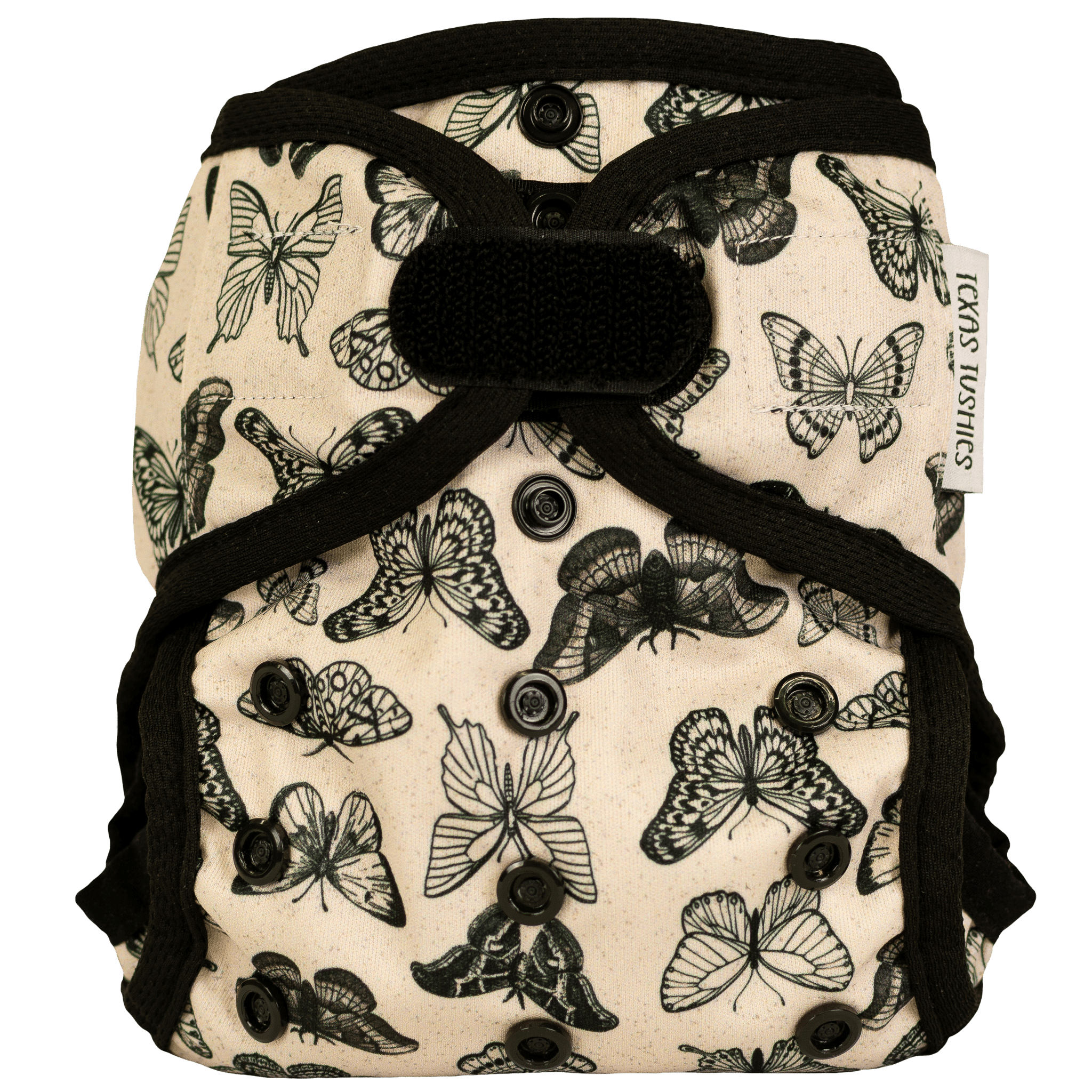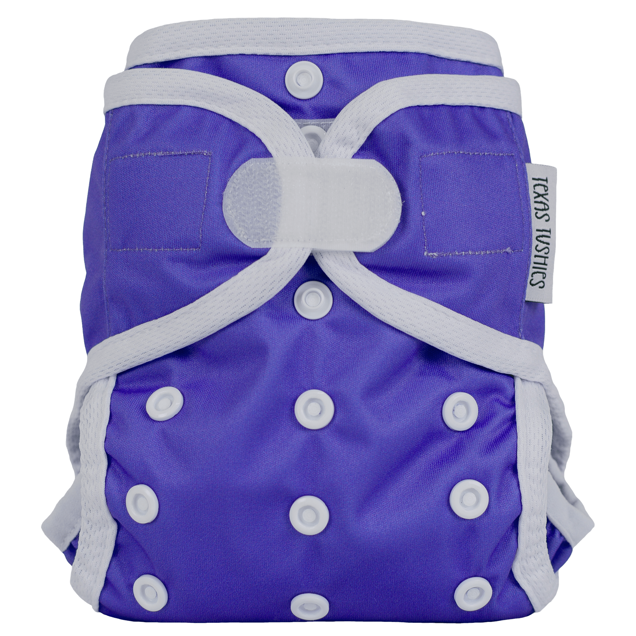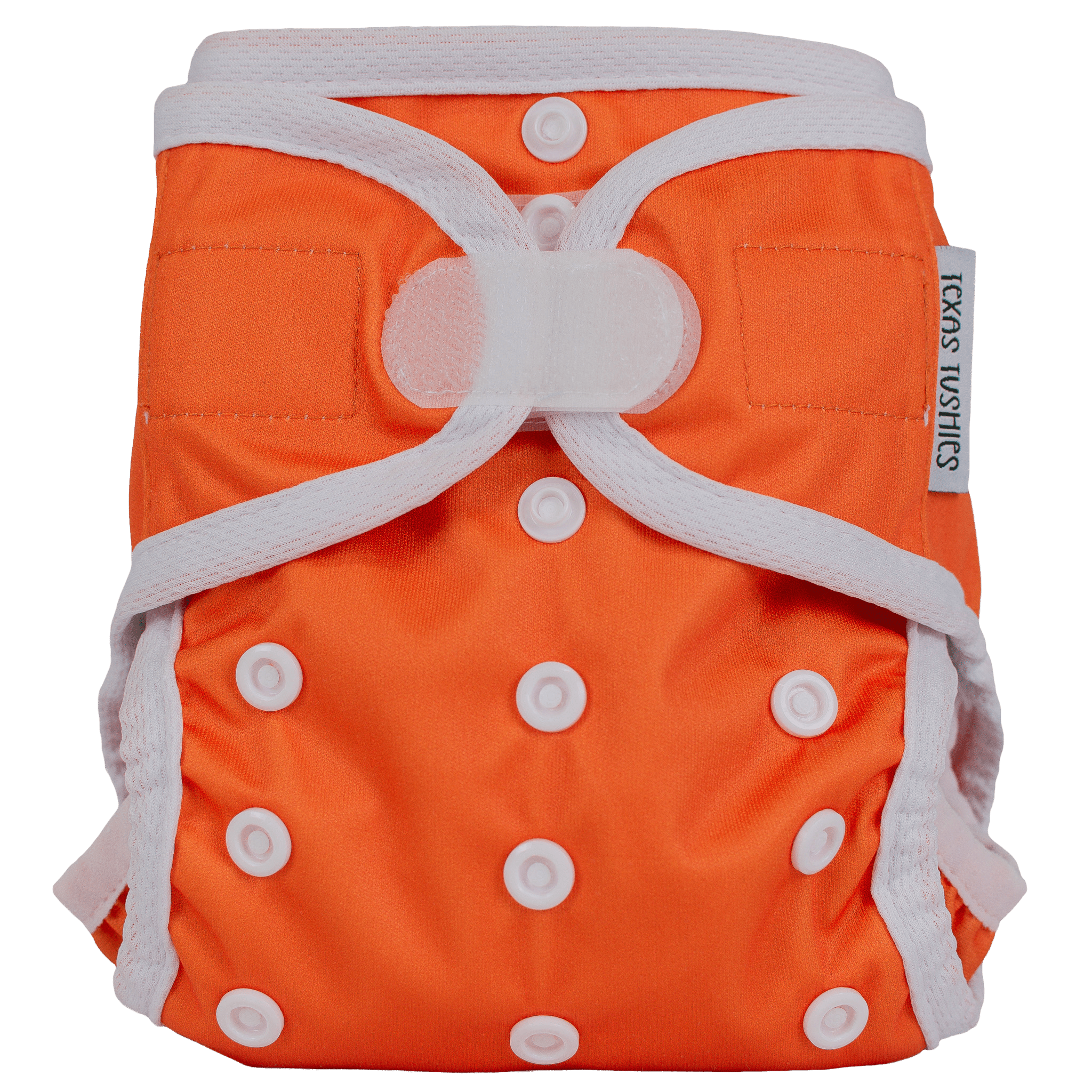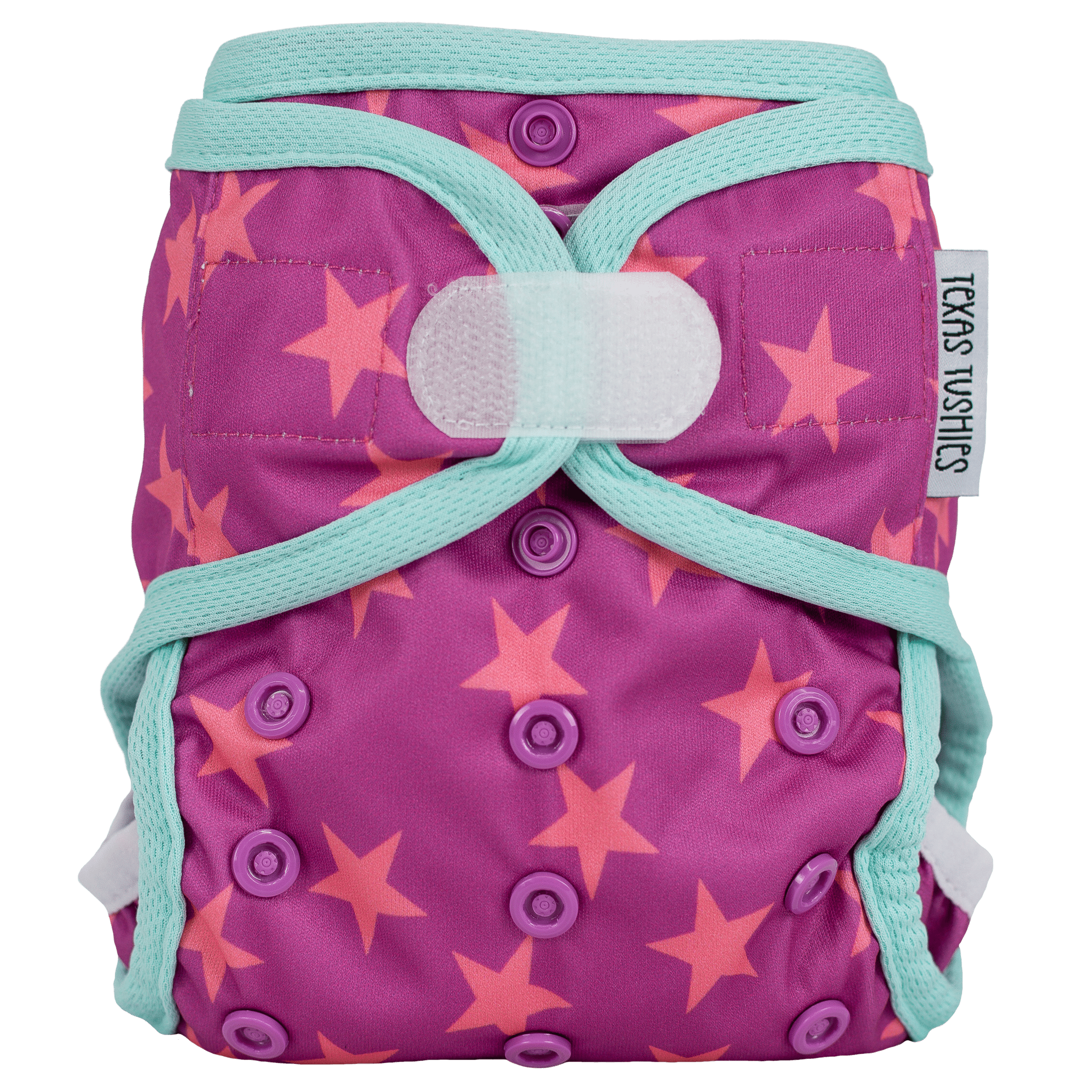 This is a Tiny Tushies Newborn Cover. This is a cloth diaper fitting babies approximately 5lbs to 20lbs, providing the most trim fit for up to one year of age.