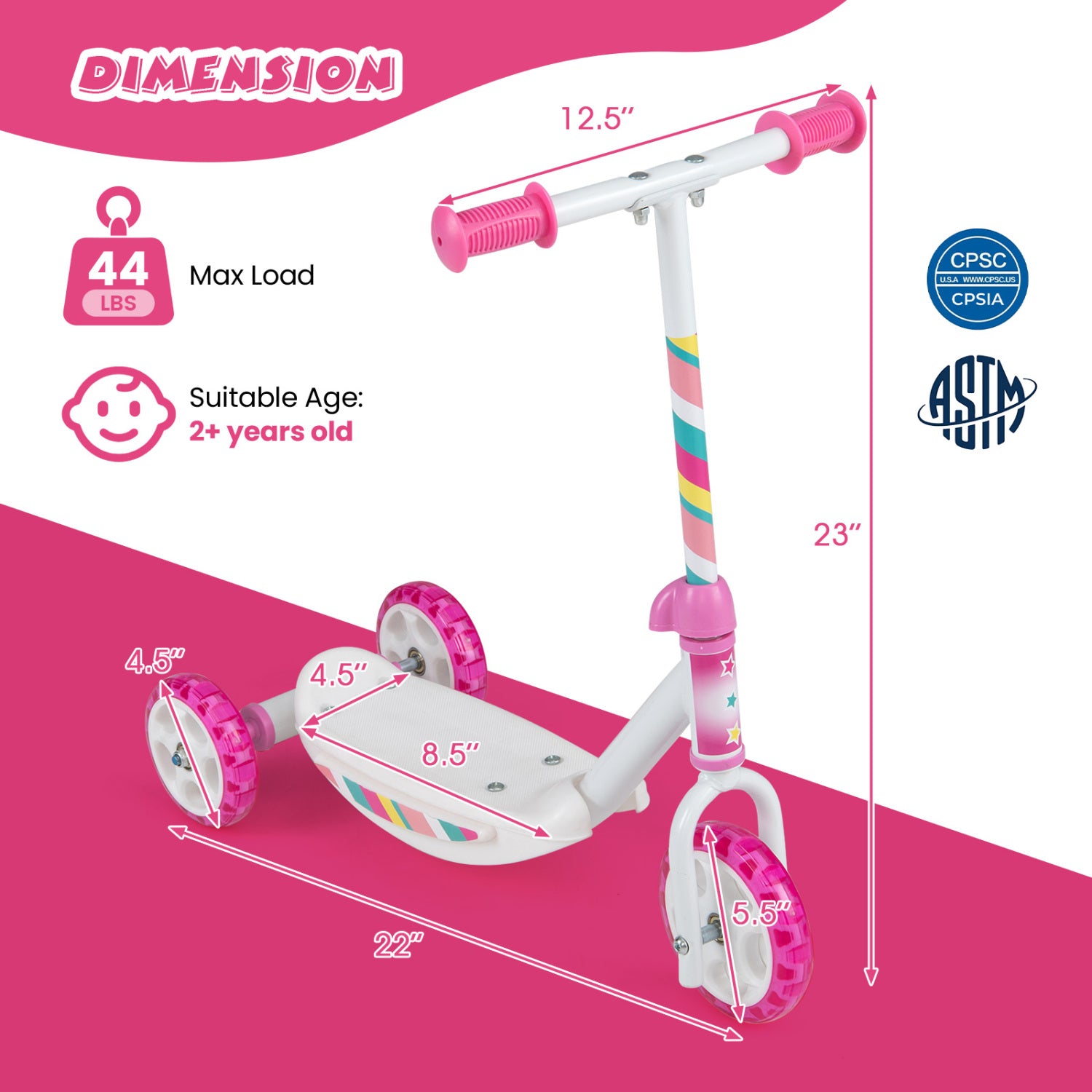 Color Pink + White Material PP + PVC + Metal Overall Dimension 22" x 12.5" x 23" Deck Dimension 8.5" x 4.5" Diameter of Front Wheel 5.5" Diameter of Rear Wheel 4.5" Max Load 44 lbs Suitable Age 2+ years old Net Weight 5 lbs Is Assembly Required Yes Box QTY 1(May vary by batch) Package Includes 1 x Kids Scooter  1 x User Guide
