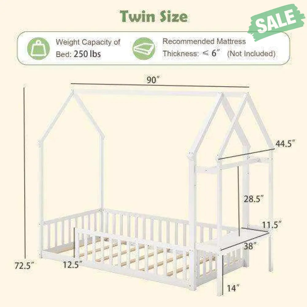 ● Transform Kid's Room: This modern house-shaped bed blends seamlessly with various home styles providing a unique touch that kids will love. Whether for sleep play or relaxation this twin size floor bed creates a personal space that feels truly special.