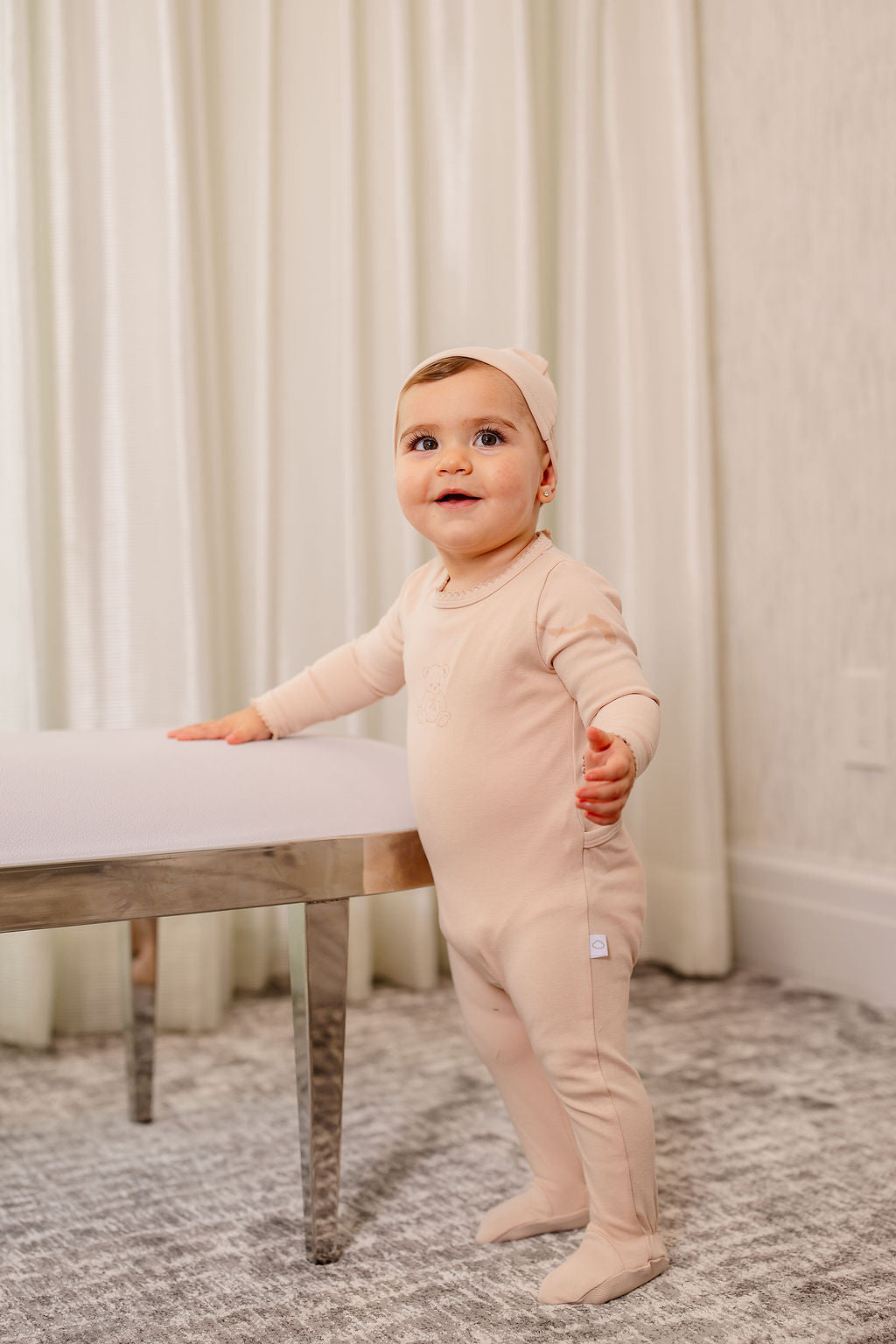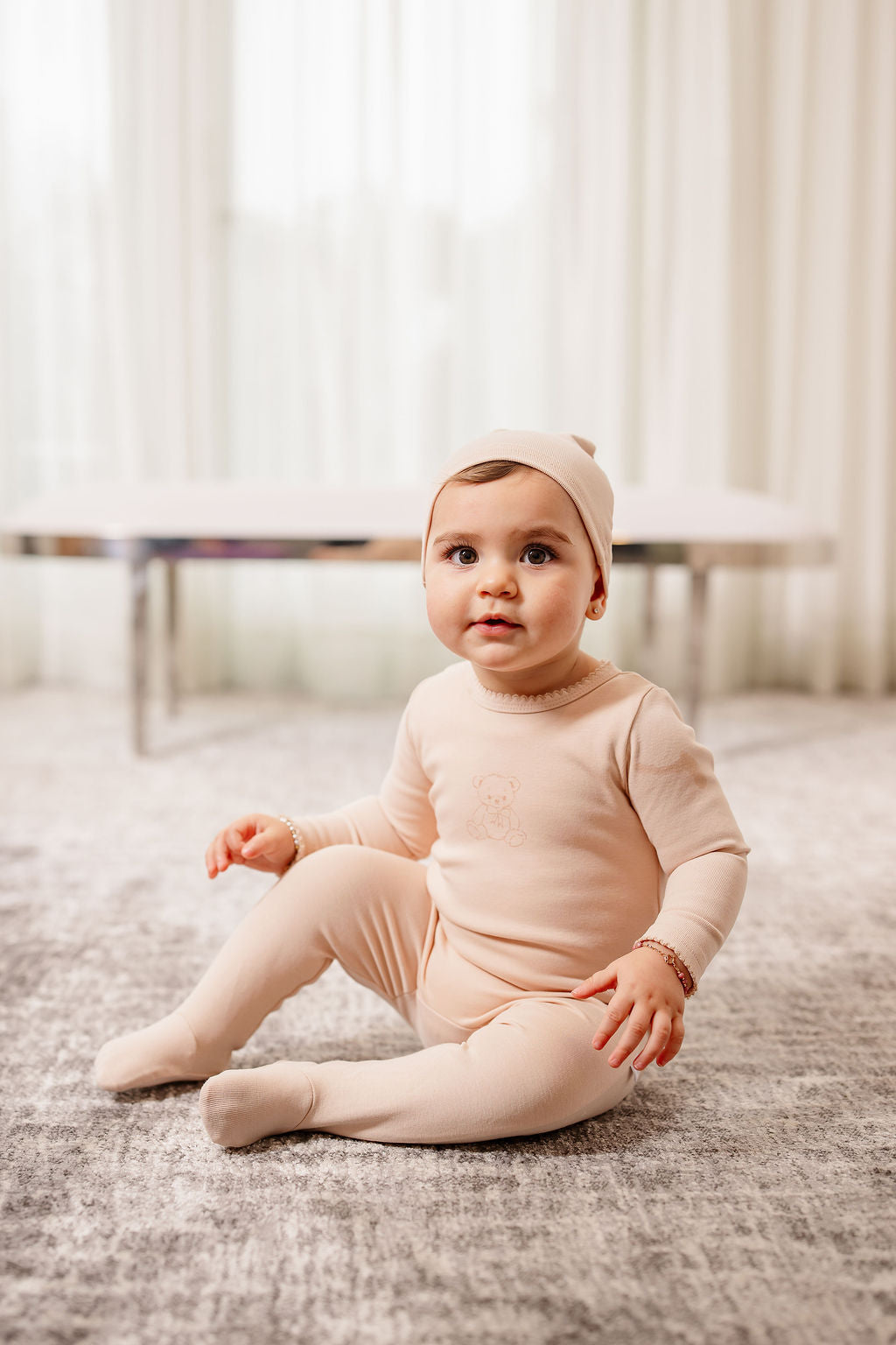 The Vintage Bear Footie in Pink is a must-have with its adorable vintage bear graphic and beautiful fit that hugs your little one comfortably. Complete with a matching hat, this playful set is perfect for cozy days filled with charm and fun!