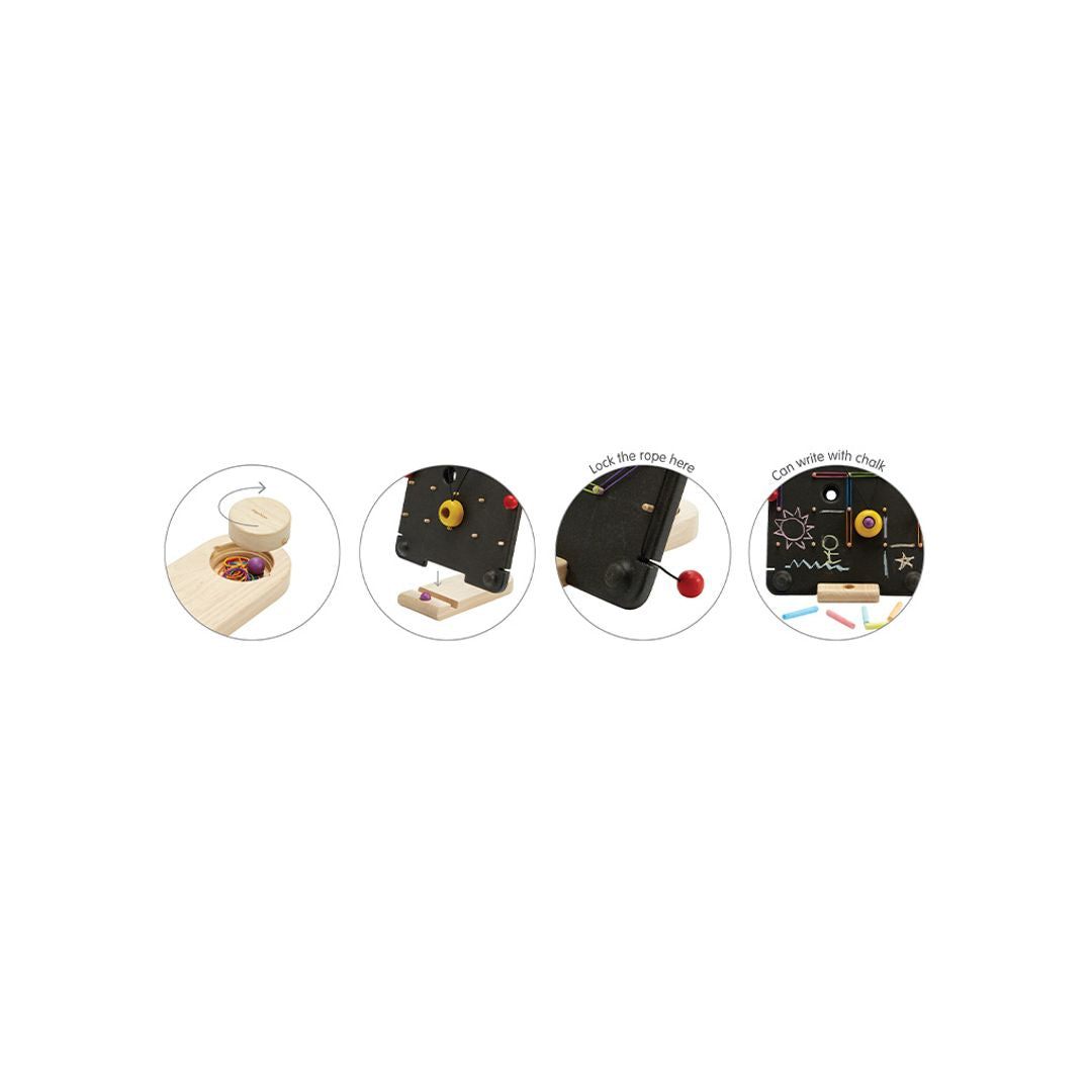 The PlanToys Wall Ball Game is a game of concentration and skill. Children can set the course difficulty using rubber bands and chalk to create obstacles that they must overcome to bring the ball from the bottom to the goal by skillfully pulling and releasing the pulleys to move the ball up the wall.