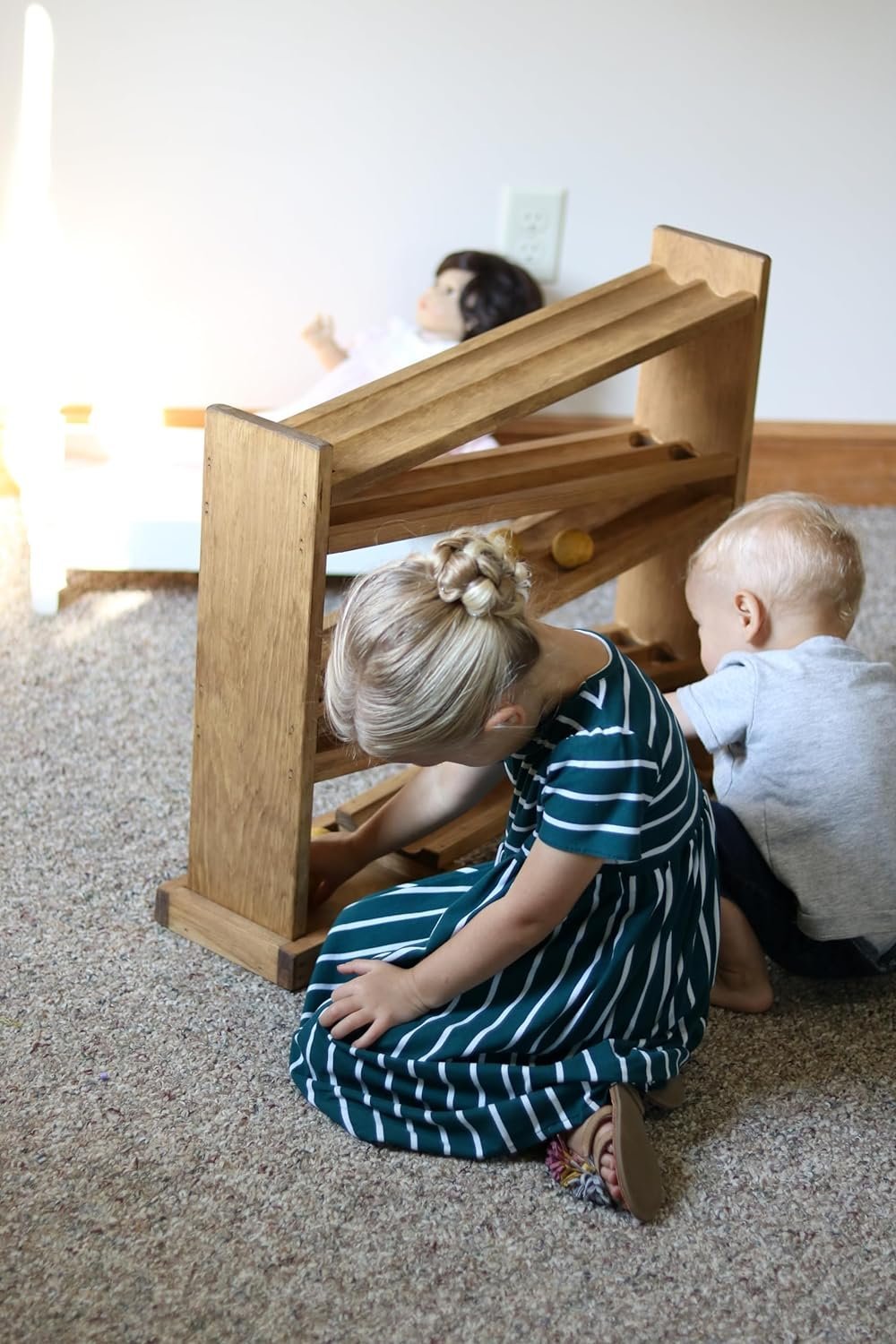 Here is a safer alternative to the old fashioned marble roller! This ball roller features wooden balls that are to big for small children to choke on. Kids are fascinated to put the balls on the tracks and watch them race each other down the tracks. The Ball Roller Racetrack is handmade by Amish Folks in Lancaster County, Pennsylvania. It comes ready to roll with eight 1.5" diameter wooden balls included, and is finished with a child-safe, non-toxic finish. Choose between Harvest Stain or Walnut Stain and Natural. Dimensions are 22"H x 26"L x 8.5"W.