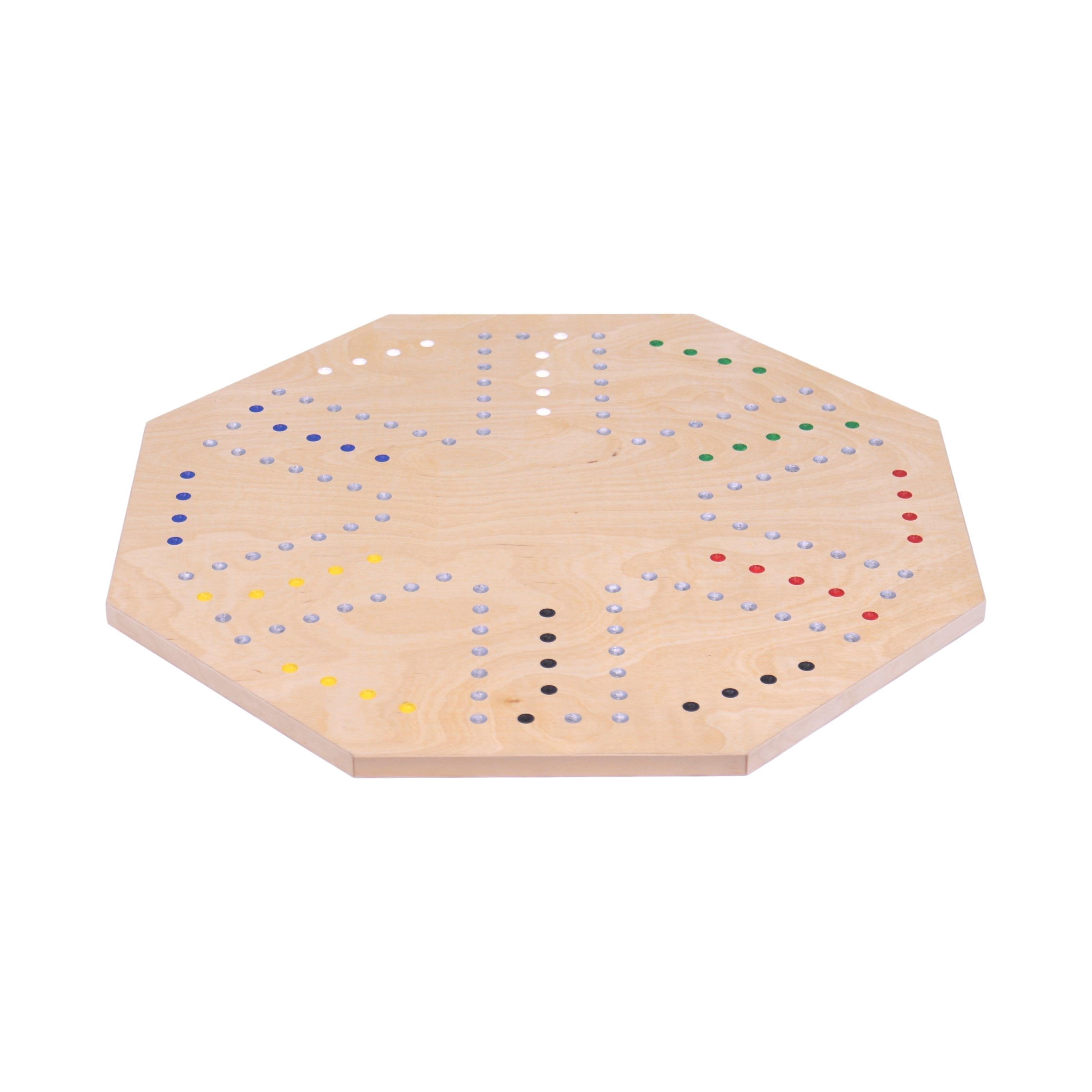 Take the classic game of Aggravation to a whole new level with this wooden Marble Chase game board. Marble Chase (also called Cards N' Marbles or Fast Track) replaces the dice in Aggravation with 2 decks of cards for more variation and fun. With its brightly colored holes and stylish layout, this new board game is sure to be a winner in your family. Don't have enough people to play on the six person side? No problem, just flip the hexagon board over and use the four player side. Comes ready to play with the 23" wide Marble Chase Game Board, a cloth drawstring bag with 24 16mm glass marbles (4 each of 6 colors), 2 Decks of Playing Cards, and Instructions for Play.