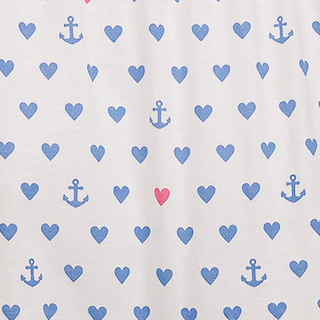 Set sail with a charming print that brings a seaside twist to classic sweetness. A delightful mix of blue hearts and tiny anchors drifts across a soft white backdrop, with the occasional pink pop adding an extra love touch.